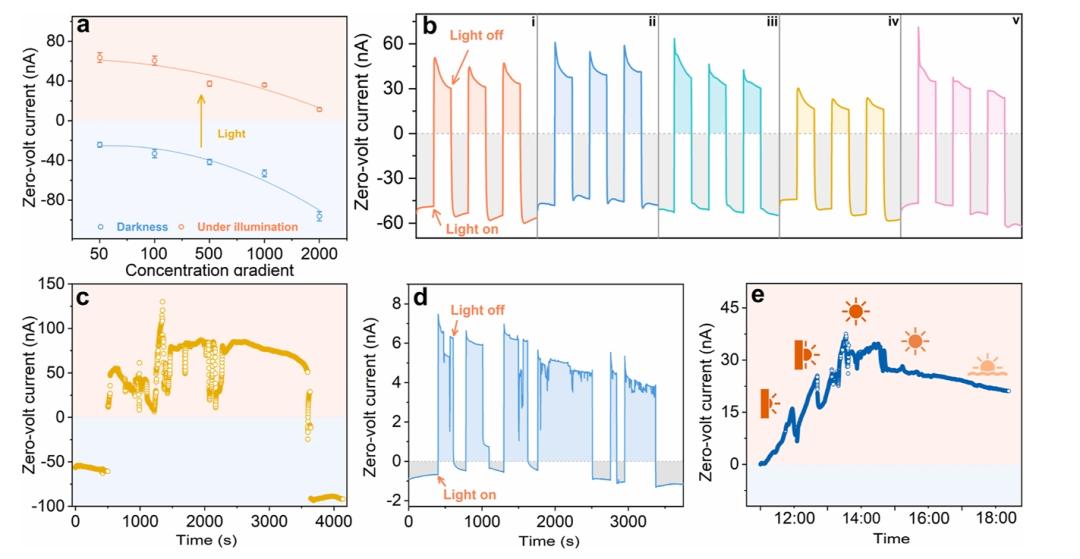 图4. 离子泵性能评估。(a) 零伏电流作为KCl浓度梯度的函数,从50倍到2000倍,说明了基于COF-PyTa的离子泵在高达2000倍梯度下传输离子的能力。(b) 在400 mW cm-2氙灯下,通过COF-PyTa膜在1000倍盐浓度梯度下(i) KCl, (ii) NaCl, (iii) MgCl2, (iv) CaCl2和(v) 四元混合物(每种物质的摩尔浓度相同)的交变照明下记录的循环零伏电流,突出显示了1 mM和1 μM之间的浓度差异。灰色背景表示被动扩散电流,而彩色背景表示主动离子泵电流。(c) 暴露在阳光下,KCl浓度梯度为1000倍(1 mM和1 μM)时,COF-PyTa膜上的零伏电流迹线。(d) 在低浓度为0.1 μM(每浓度为0.025 μM的KCl, NaCl, CaCl2和MgCl2)至2 μM的四元混合物(每浓度为0.5 μM)中,通过COF-PyTa膜在自然阳光下交变暴露的循环零伏电流。灰色背景表示被动扩散电流,而彩色背景表示主动离子泵电流。为了验证膜优异的光反应可逆性,研究人员特别改变了时间间隔来评估膜的离子泵性能。(e) 在阳光照射下COF-PyTa膜上的零伏电流轨迹,对称水样经一次反渗透处理,电导率为1.2 μS cm-1。总之,通过亚胺键的垂直梯度质子化,该研究成功地开发了具有层内和层间异质结构的COF膜。这些膜表现出更好的光吸收,并保持长寿命的电荷分离状态,其特点是快速的光响应和泵送效率。膜内显著的光致电场驱动离子跨越2000倍浓度梯度进行传输,显著提高了深度脱盐效率。在自然阳光下,这些膜可以进一步从最初通过初级反渗透处理的水中浓缩离子。该研究中的不对称质子化COF膜的通用合成方法可以扩展到各种单体,如2,5-噻吩二甲醛和噻吩[3,2-b] -2,5-二甲醛,显示出优越的光响应离子传输能力。未来的研究重点是优化这些构建单元,预计将进一步提高离子泵的效率,为先进的海水淡化技术提供一种具有成本效益、强大且环保的解决方案。