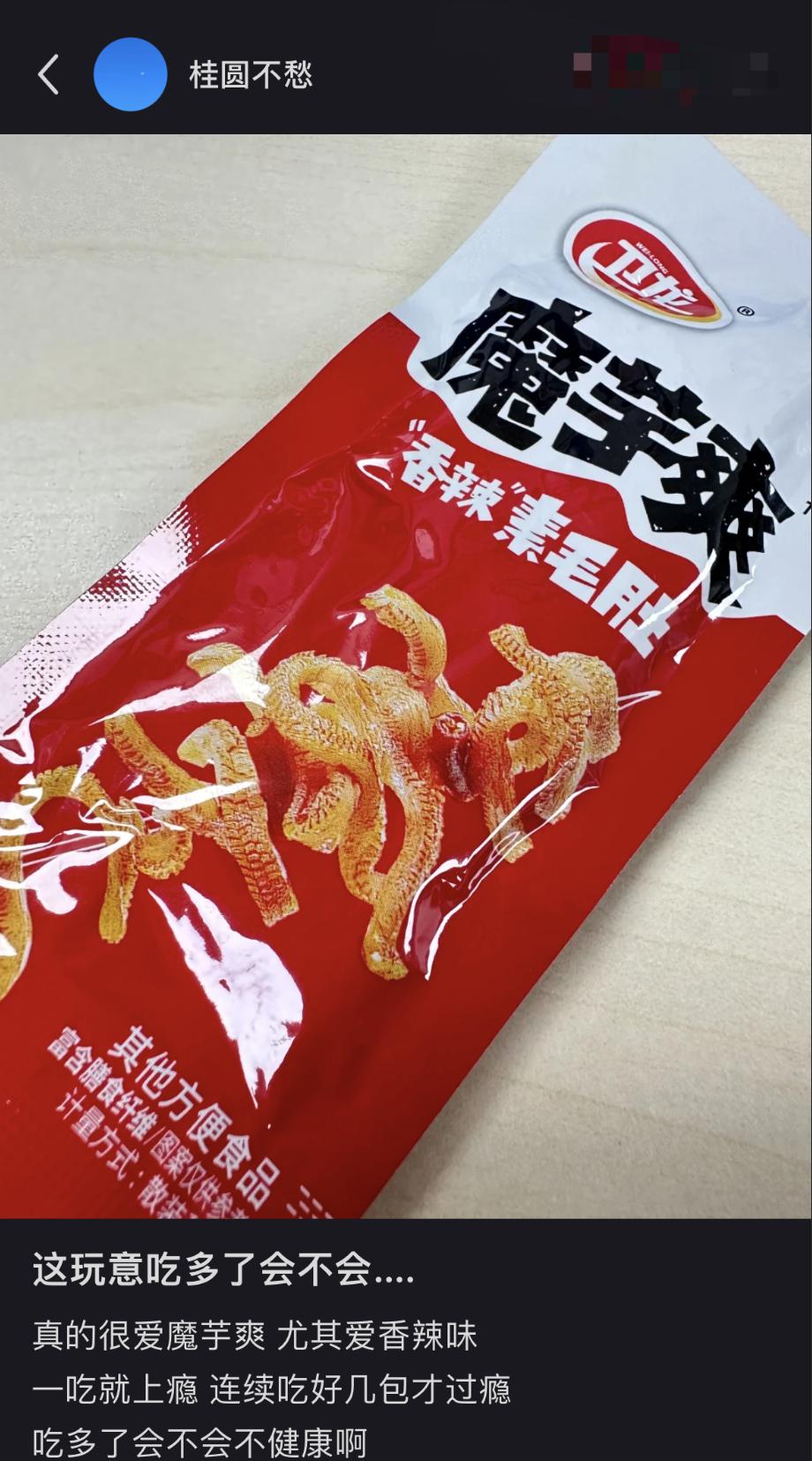 有人说,魔芋爽是一种相当歹毒的食物,因为它明明十分不健康,却总会伪装成一种人畜无害的模样,接近打工人。“魔芋本身没有味道,所以无论是哪个品牌的素毛肚,都会添加许多盐、辣椒油、白糖,来增加保质期,提味和提鲜。所以大家过量服用素毛肚后,第二天大概率会水肿,疑惑自己为什么忽然胖了三斤,陷入深深的自我怀疑中。”