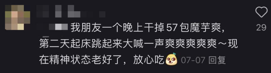 “但它的魔力之处在于,每一个吃过它的人,都会无可避免地彻底沉沦。连打工人自己都说不清楚,为什么当年嗦过一口魔芋爽后,就忍不住连吃了五六七八包,最后整个工位都囤满了这种小零食。有人甚至怀疑过,它的配料表里到底有没有违禁物。”“唯一合理的解释,就是它的麻辣口味,恰好击中了打工人渴望的精神刺激点。并且咀嚼起来的口感,也像是薯片一样,让人欲罢不能。”