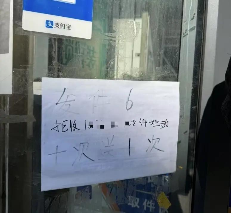 这不是个例,上个月,内蒙古包头一个女孩发现,自己的个人信息被家附近的驿站“挂”在了驿站玻璃门上,写着她的姓和手机号,注明“十次送一次”。