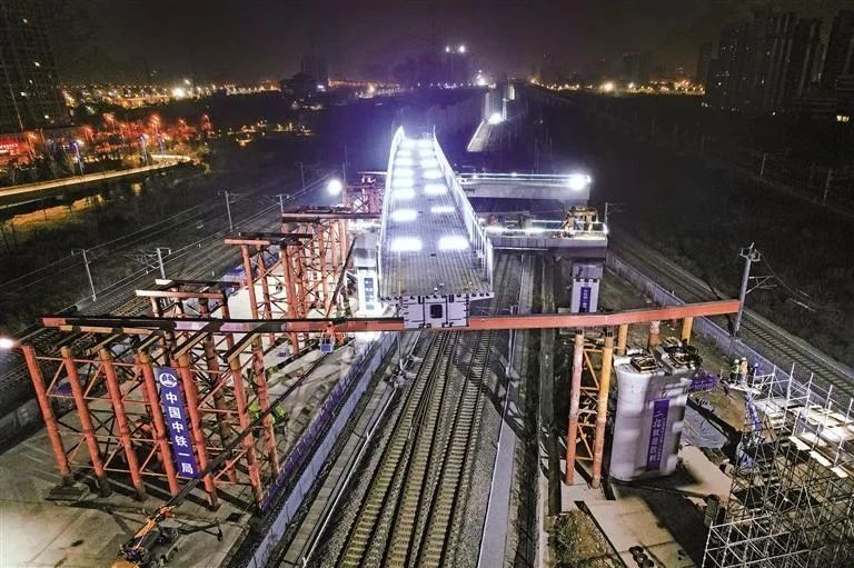 12月6日凌晨4时,在西安北站施工现场,由中国铁路西安局集团有限公司(以下简称“西安铁路局”)第二工程指挥部管理、中铁一局承建的新建西延高铁西安枢纽联络线跨大西高铁连续钢箱梁成功转体。这是西北规模最大、首次在高铁枢纽站(西安北站)内进行的跨既有高铁连续钢箱梁转体施工。