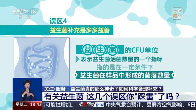 · 第四个误区:益生菌补充是多多益善。我们经常在益生菌产品上,看见CFU标记。益生菌的CFU单位是用来表示益生菌活菌数量的一个指标。它指的是在一定条件下,益生菌在样品中形成的菌落数量。商家对于益生菌的宣传动辄含有8000亿(CFU)、1万亿(CFU)的数量,先不论拿到消费者手中真正还有多少活菌,单就益生菌本身而言,并不是补充越多越好。人体菌群保持平衡