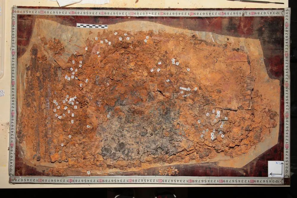 图为套箱提取的海昏侯墓甲片堆积物。江西省文物考古研究院供图江西省文物考古研究院研究员、海昏侯墓考古发掘领队杨军介绍,这批甲片被发现于刘贺墓西藏椁武器库,与刀剑伴随出土,据现场漆皮痕迹推测,当时被装在漆箱中。出土时漆箱已腐烂,铠甲、刀剑呈堆砌状,“海昏侯墓先后经历地震、鄱阳湖水南侵造成的地下水位上升,埋藏环境导致甲片质地轻薄脆弱,我们决定对文物进行整体套箱提取,再通过实验室考古进行保护研究”。