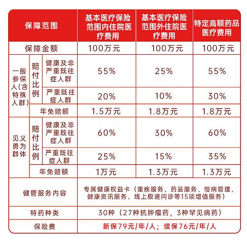 2024年“来宾惠民保”作为来宾市唯一一款由政府指导的普惠型商业补充医疗保险,具有“低门槛、低保费、高保额、广覆盖”等惠民特点,保费只需79元/人,续保还有3元/人的优惠,让广大来宾人民群众都能买得起。