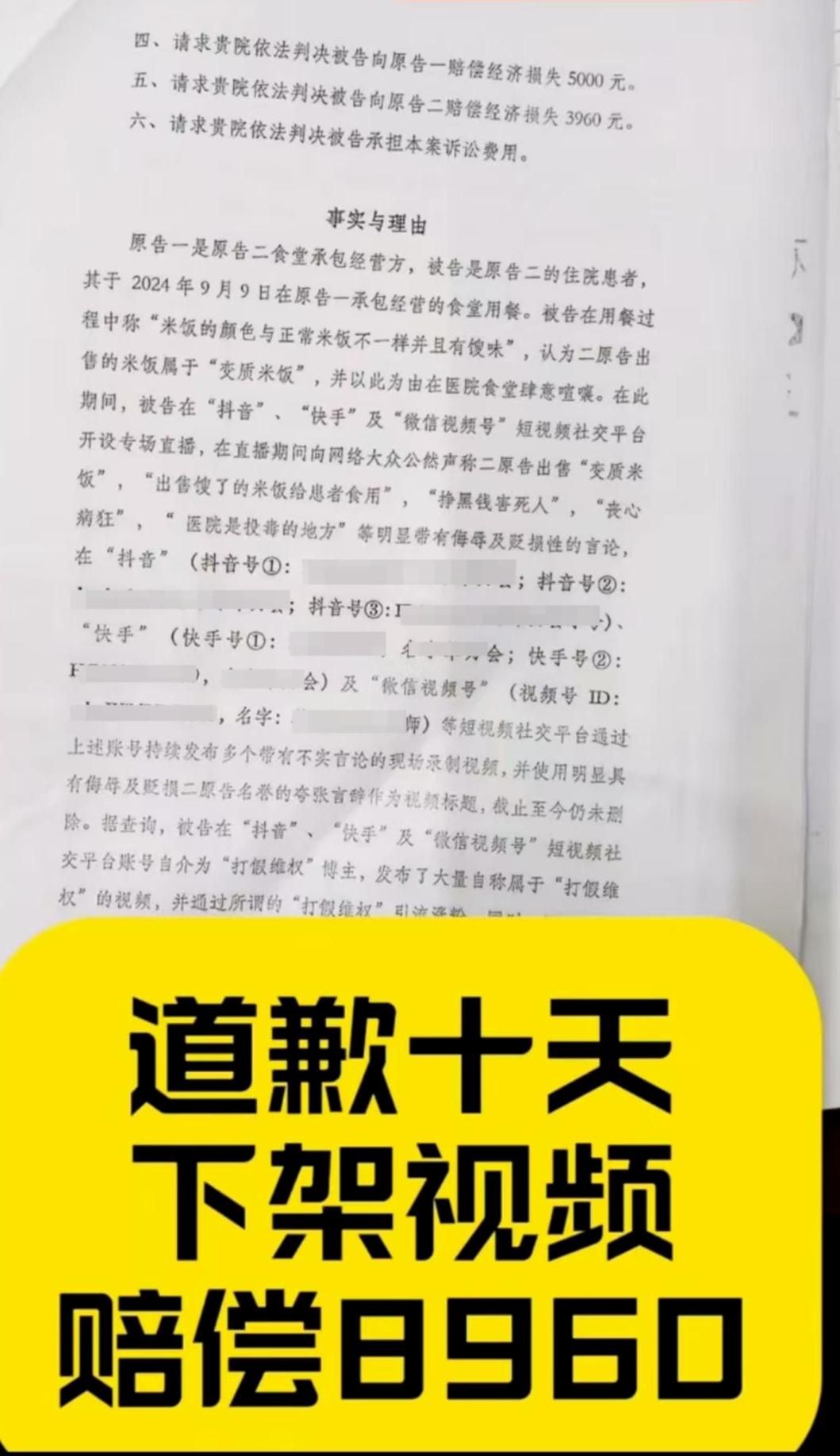 近日,有博主在社交平台发布信息反映,自己因此前投诉医院食堂售卖变质米饭一事,接到了诉讼请求为“道歉十天、下架视频、赔偿8960元”的民事起诉状。