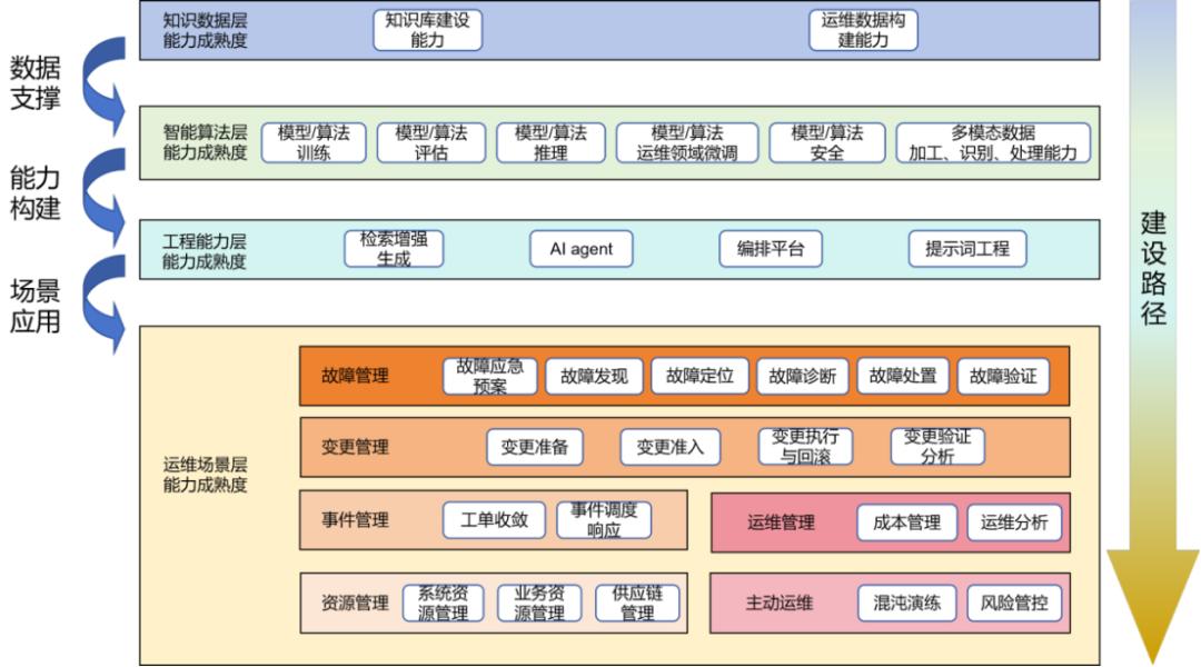 《基于人工智能的云计算运维能力成熟度模型》规定了在云计算场景下人工智能技术在运维全生命周期能力建设和场景应用层面的成熟度模型。本标准将从知识数据层、智能算法层、工程能力层和运维场景层四大能力层全方面进行规范,以知识库建设,运维数据构建为数据基础,推进模型/算法训练、评估、推理、微调等智能能力建设,组合并构建AI agent,题词工程,检索增强等工程能力,应用于变更、事件、故障、资源,运维管理,主动运维等运维场景。