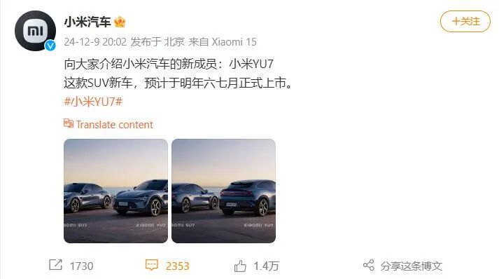 北京时间12月9日周一晚间,小米汽车首次在社交媒体发布小米首款SUV的图片,为大家正式介绍小米汽车的新成员小米YU7,并表示,这款SUV新车预计明年六七月份正式上市。