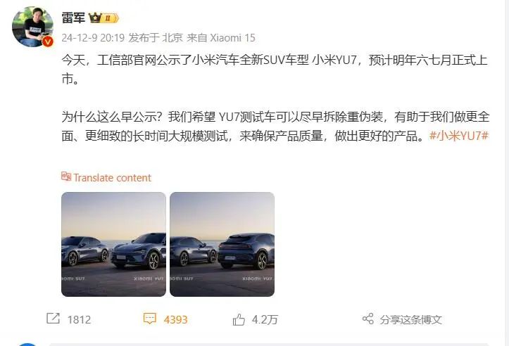 小米创始人兼CEO雷军周一称,之所以这么早公示YU7,是因为小米希望YU7测试车可以尽早拆除重伪装,有助于公司做更全面、更细致的长时间大规模测试,来确保产品质量,做出更好的产品。