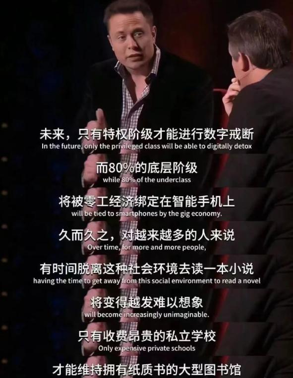 马斯克最近接受采访时说:“未来,只有特权阶级才能进行数字熔断。而80%的底层阶级将被零工经济绑定在智能手机上”。