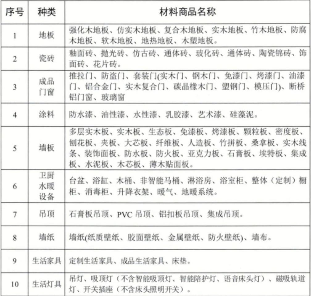 包括个人消费者购买的地板、瓷砖、成品门窗、涂料、墙板、厨卫水暖设备、集成吊顶、墙纸、生活家具(含定制)、生活灯具等。