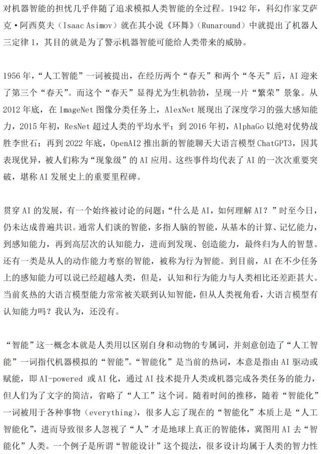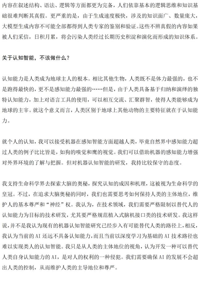 “智能是人类区别于其他动物的专有特征,特别是认知能力。我们可以接受机器在感知能力方面超越人类,但对机器认知智能的研发,需要高度审慎。从科技伦理的视角来看,我们为什么要造出一个替代我们认知的东西?”