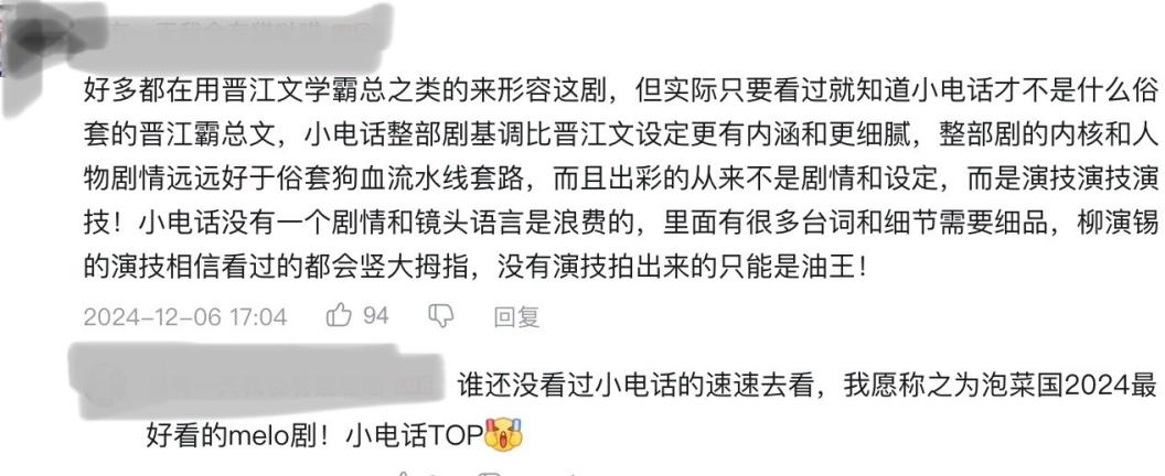 在网文改编的长视频作品中,演员的演技尤为重要。原著已经积累了大量忠实读者,他们对小说中细腻的情感有着深刻的认识。如果演员的表演流于模式化的大开大合,很容易让观众产生审美疲劳。饰演《现在拨打的电话》的男主的柳演锡,曾获SBS演技大赏荣誉,以及青龙奖、百想艺术大赏和大钟奖多项提名,被称为“演技派下沉来演偶像剧”。在该剧中,他的演技成为了吸粉的重要利器,被评价为“真把小说里的形容词都演出来了!”“凭入木三分的演技把玛丽苏文男主演出了灵魂”。