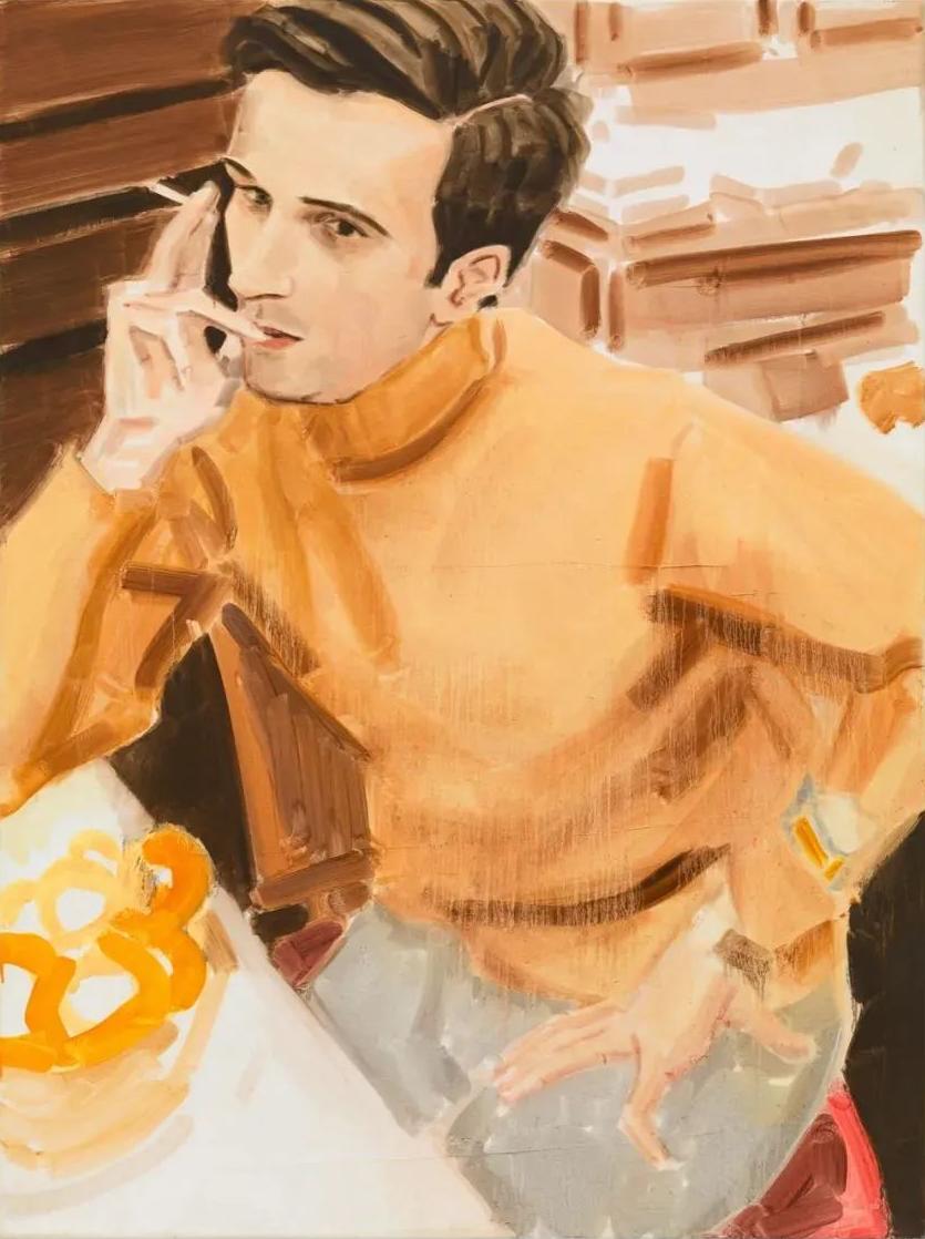 石良1988年毕业于中央美术学院油画系。《浪者》描绘了一位略显忧郁的男子抱臂靠墙而坐,微微仰望天空,似在沉思。