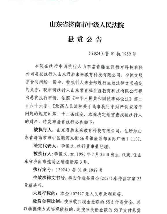 本院在执行申请执行人山东常青藤生涯教育科技有限公司与被执行人山东君胜未来教育科技有限公司、李恒文服务合同纠纷一案中,被执行人未全部履行生效法律文书确定的义务,现申请执行人山东常青藤生涯教育科技有限公司提出悬赏执行申请。依照《中华人民共和国民事诉讼法》第二百六十六条、《最高人民法院关于民事执行中财产调查若干问题的规定》第二十二条规定,本院决定悬赏查找被执行人的财产,特发布悬赏执行公告如下: