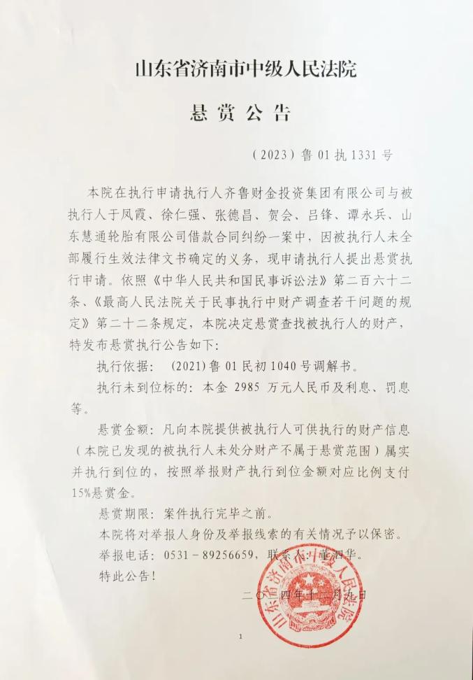本院在执行申请执行人齐鲁财金投资集团有限公司与被执行人于凤霞、徐仁强、张德昌、贺会、吕锋、谭永兵、山东慧通轮胎有限公司借款合同纠纷一案中,因被执行人未全部履行生效法律文书确定的义务,现申请执行人提出悬赏执行申请。依照《中华人民共和国民事诉讼法》第二百六十二条、《最高人民法院关于民事执行中财产调查若干问题的规定》第二十二条规定,本院决定悬赏查找被执行人的财产,特发布悬赏执行公告如下: