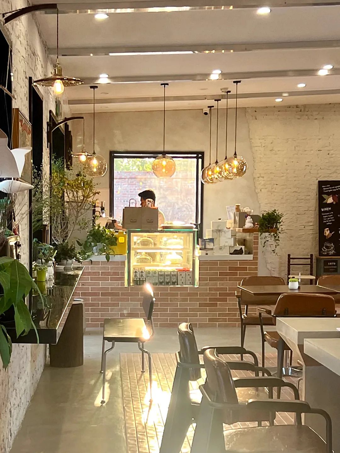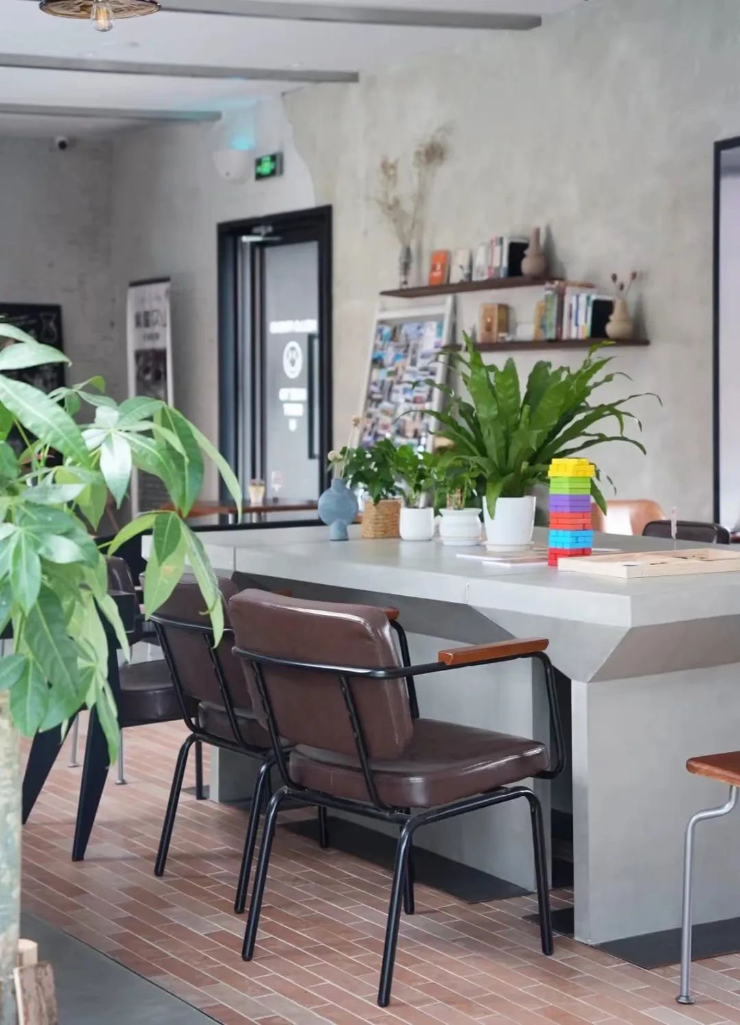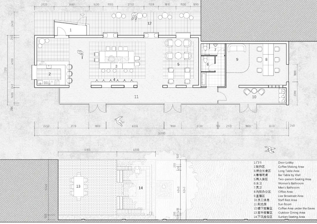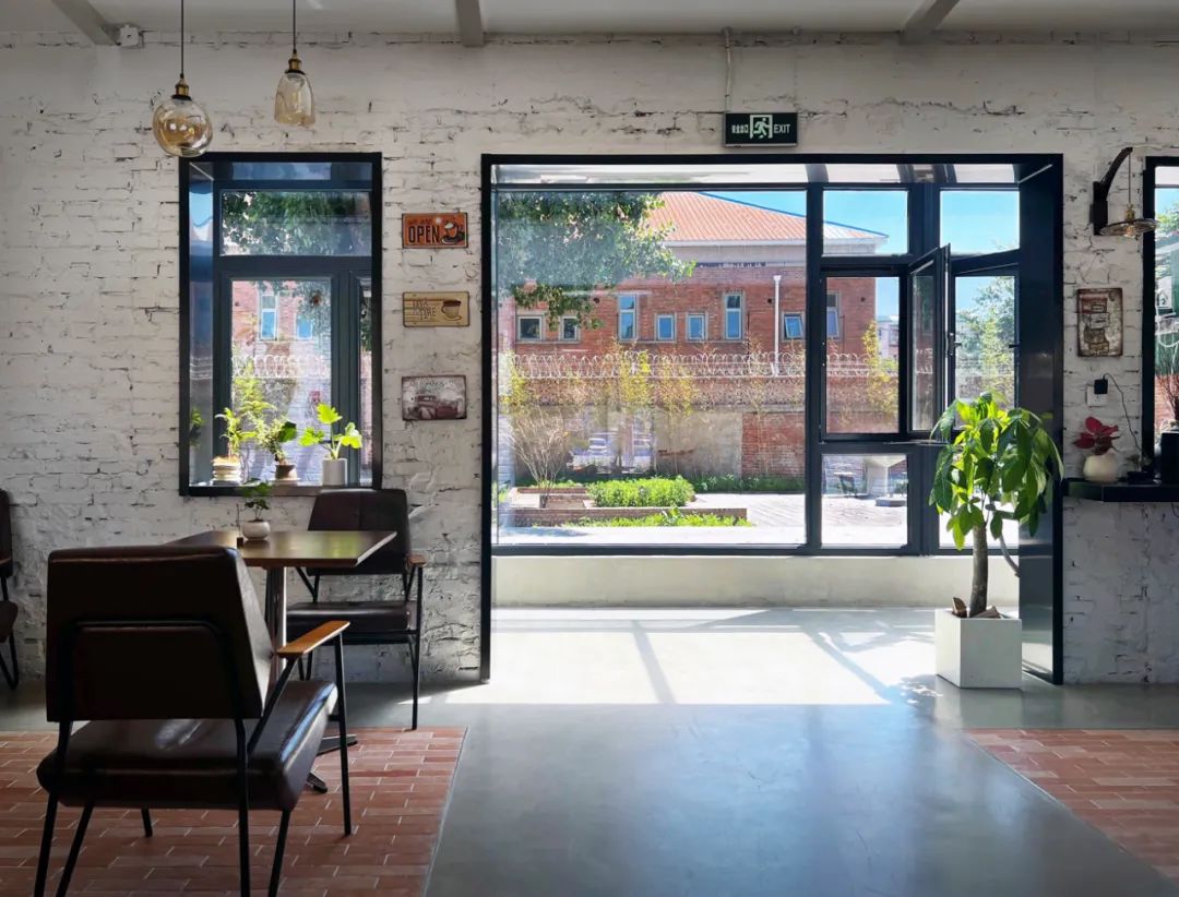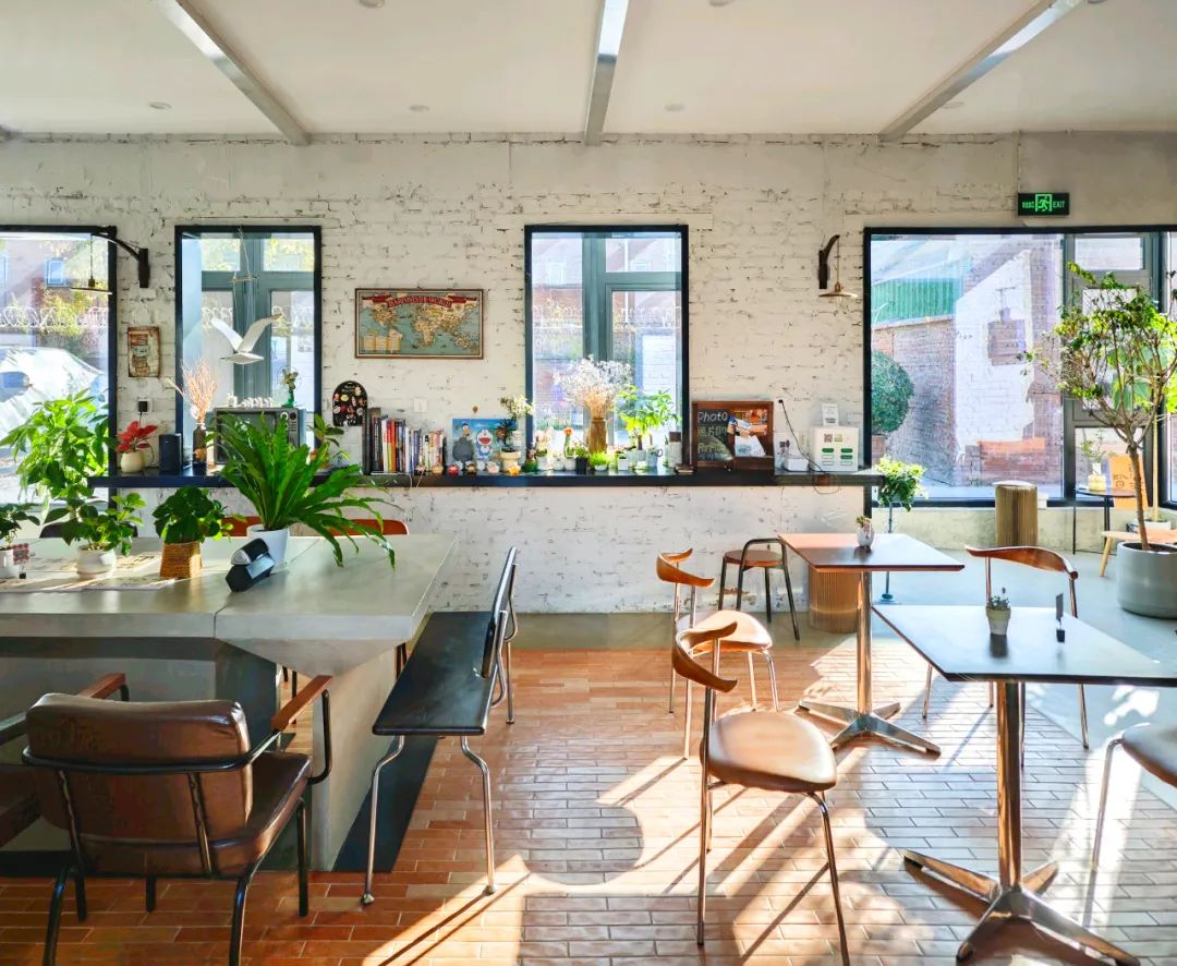 The coffee area is used to meet daily dining and hold various forms of activities. We placed the production area in the southwest corner of the coffee area to make the remaining space complete and suitable for holding activities. We knocked down the wall under the window on the north side of the production area, and built a door lobby outside it as the main entrance, so that customers can come in and face the production area. There are window and door openings of different sizes on the original brick wall on the south side of the coffee area. We retain this characteristic wall and divide the coffee shop into a long table area and a double dining area at the location of the two door openings. At the same time, a long bar and leisure seats are set up on the north and south sides of the wall. The furniture in the long table area is designed in a modular form that can be freely combined and moved to adapt to various scenarios.