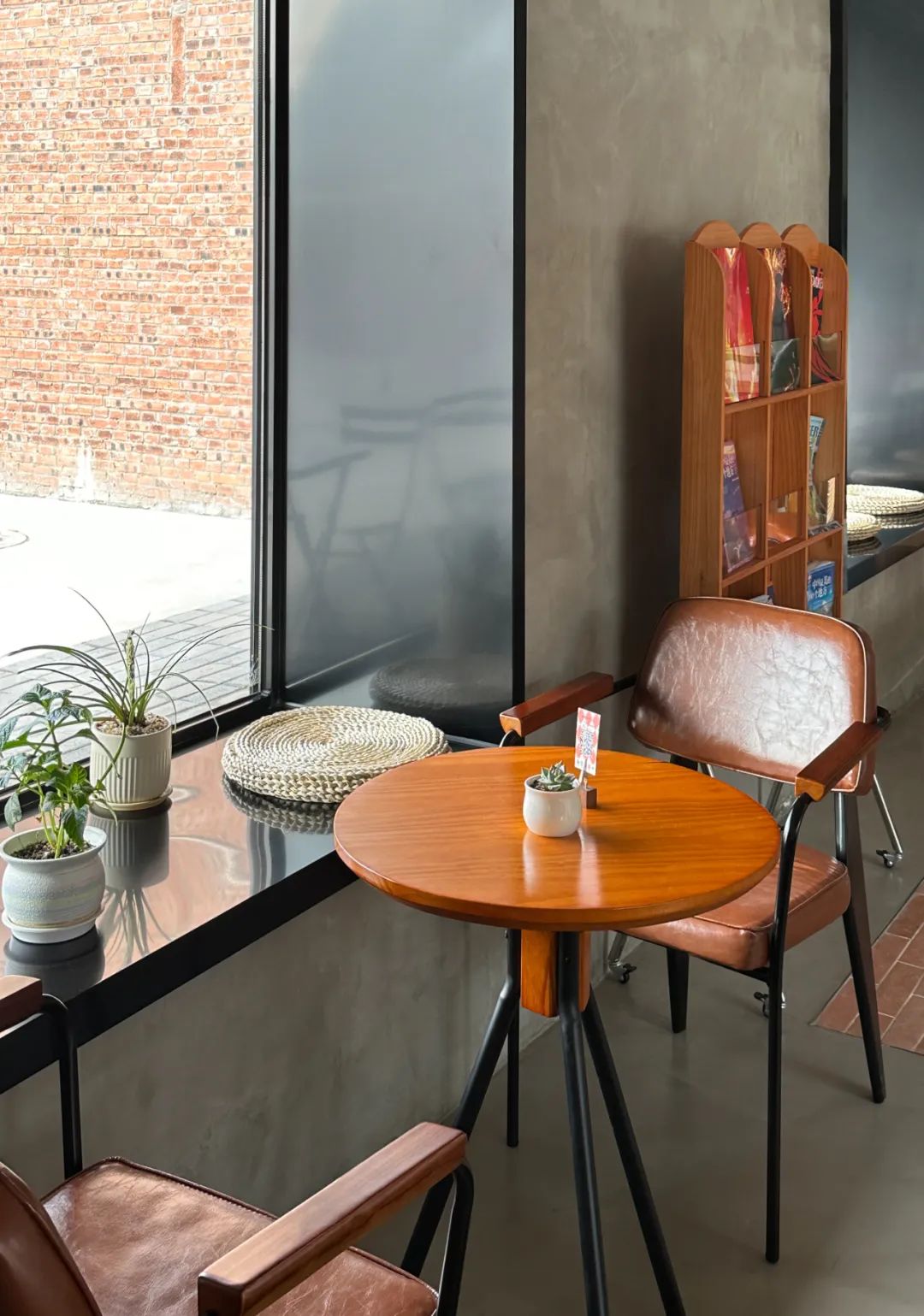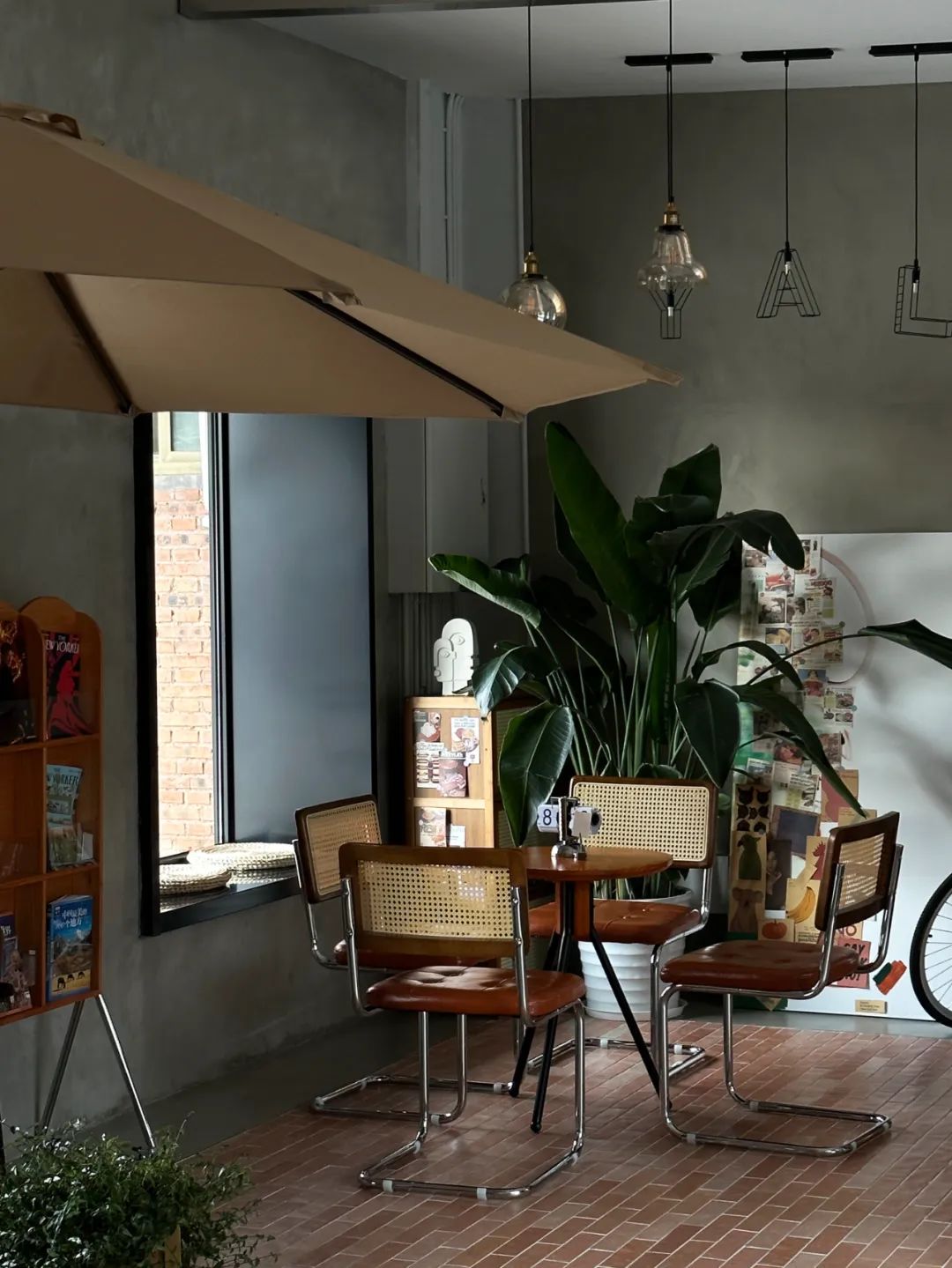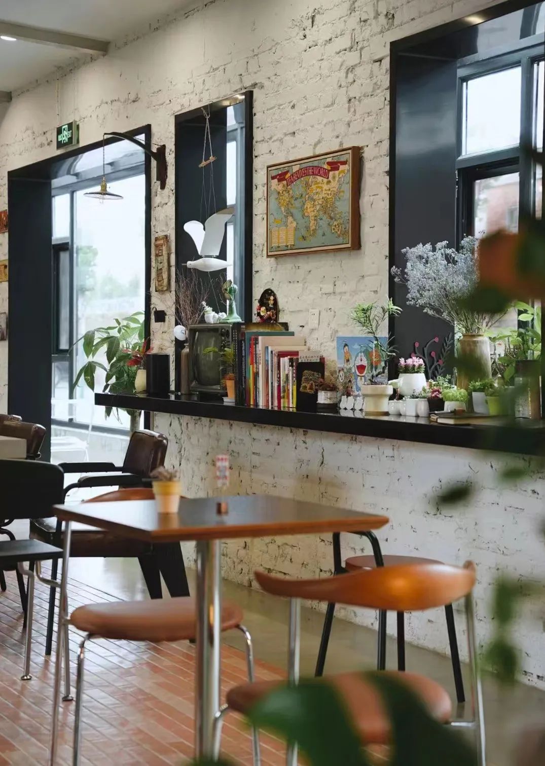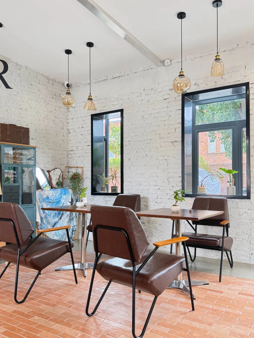 The original indoor floor had floor tiles, which were old and damaged. The design decided to flatten them and then make a micro-cement surface layer on them, and use red bricks to emphasize the entrance bar area, the middle long table area and the double area on the east side. The red bricks are also laid vertically on the side panels of the bar, adding a warm tone to the interior. The original door and window openings were rugged, so I used dark gray metal plates to cover the openings to emphasize the outline lines. The design added bay windows on the north and west facades.