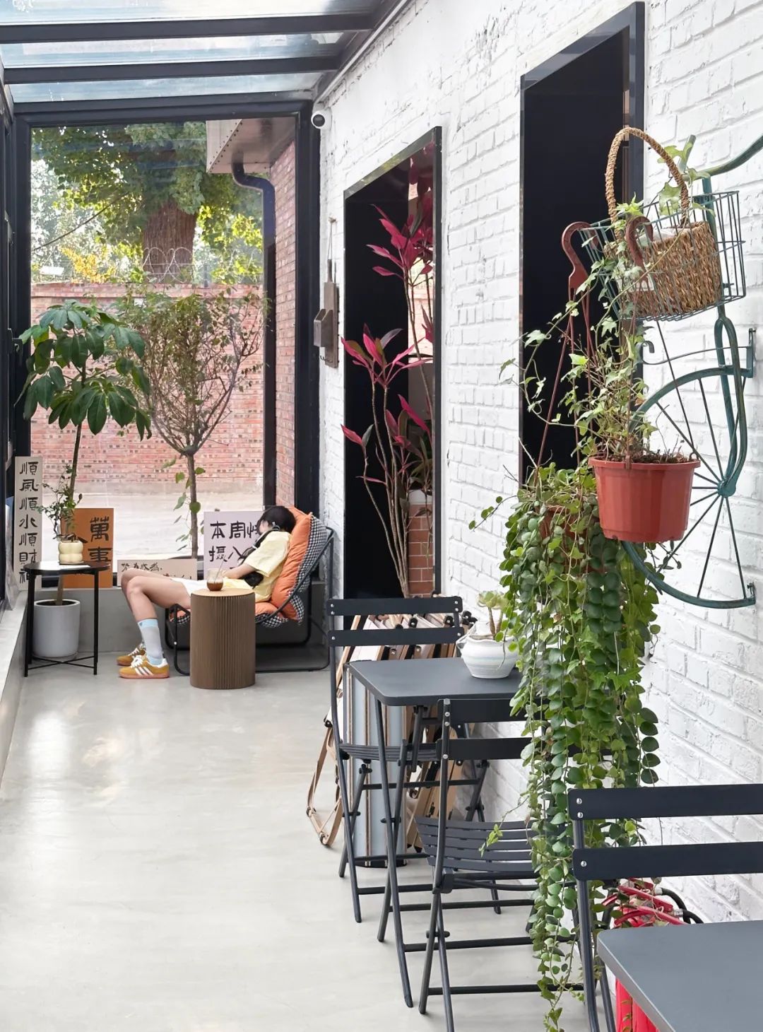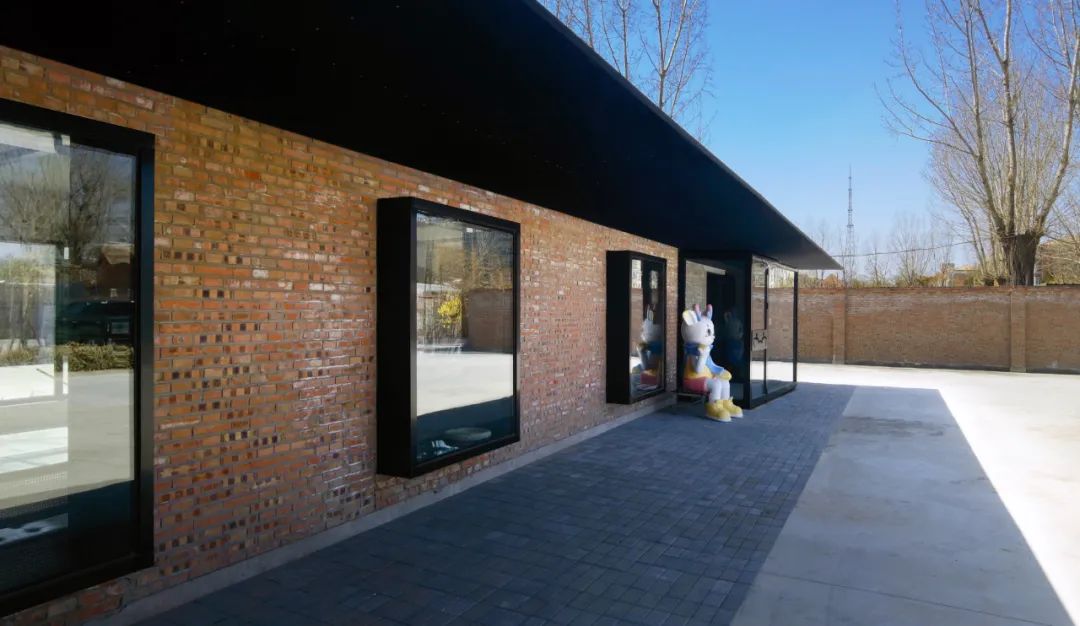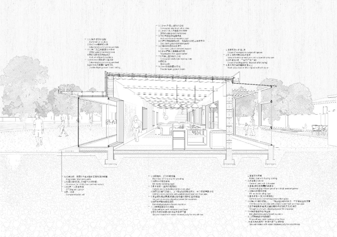 北侧屋檐处增加黑色雨棚,在下方地面铺砌灰砖,限定出一个半室外的就餐区域。建筑的南面是通透的阳光房,并作为对外展示的橱窗,走过的行人可看到里面延墙布置的座椅,窗台上的陈设,精心打理的盆栽。客人坐在阳光房里还可以看到一路之隔的另一处室外就餐区,那里用红砖和混凝土打造了一处下沉座椅区。C字形的座位紧邻着一颗大树并围绕着一处火塘,天气好的时候人们可以坐在树下看书,冬天寒冷的时候可以围坐在这里烤火。