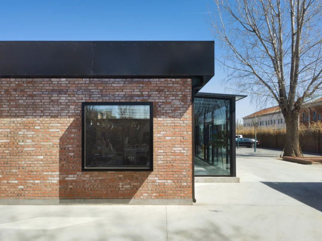 原本室内地面有地砖,已老旧破损,设计决定平整后在上面做微水泥面层,并用红砖强调出入口制作区、中间长桌区和东侧双人区。红砖还垂直延伸到吧台的侧板上,给室内增添了温暖的色调。原有门窗洞口凹凸不平,设计采用深灰色金属板包口,强调出洞口轮廓线。设计在北立面和西立面上加建了凸窗。建筑的北面作为向园区展示的主立面,其朴实的红砖与黑色金属和玻璃的碰撞,展现出新旧之间的对比。
