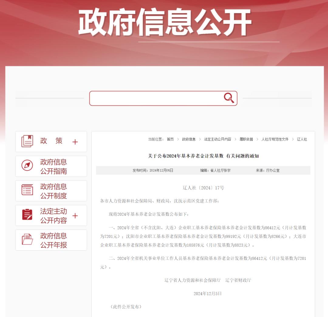 一、2024年全省(不含沈阳、大连)企业职工基本养老保险基本养老金计发基数为86412元(月计发基数为7201元);沈阳市企业职工基本养老保险基本养老金计发基数为99192元(月计发基数为8266元);大连市企业职工基本养老保险基本养老金计发基数为105876元(月计发基数为8823元)。