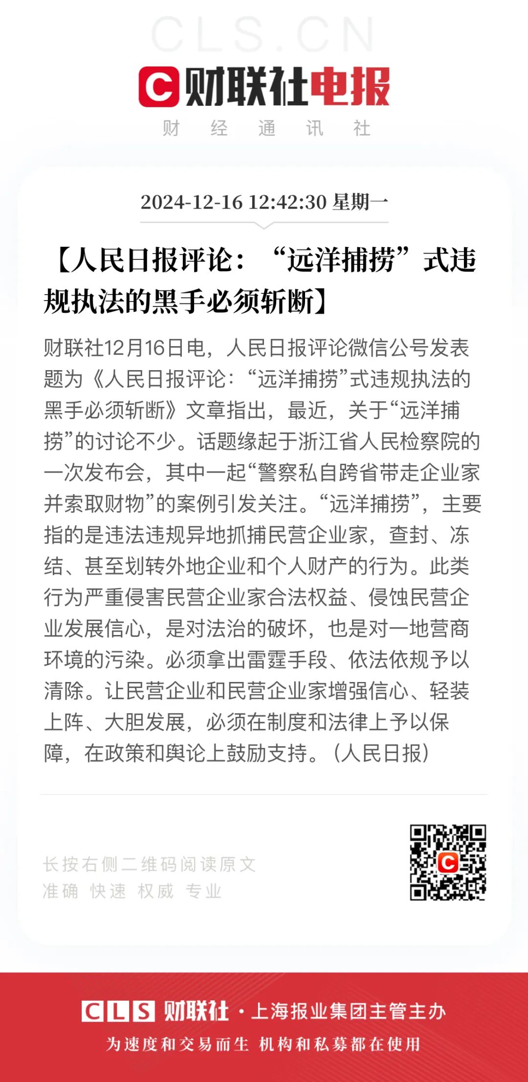 人民日报评论微信公号发表题为《人民日报评论:“远洋捕捞”式违规执法的黑手必须斩断》文章指出,最近,关于“远洋捕捞”的讨论不少。话题缘起于浙江省人民检察院的一次发布会,其中一起“警察私自跨省带走企业家并索取财物”的案例引发关注。“远洋捕捞”,主要指的是违法违规异地抓捕民营企业家,查封、冻结、甚至划转外地企业和个人财产的行为。