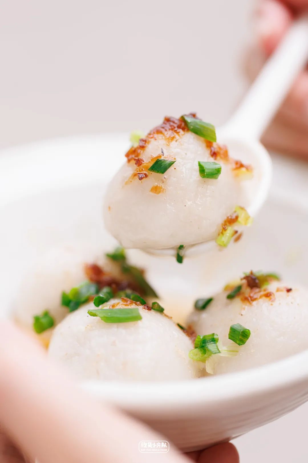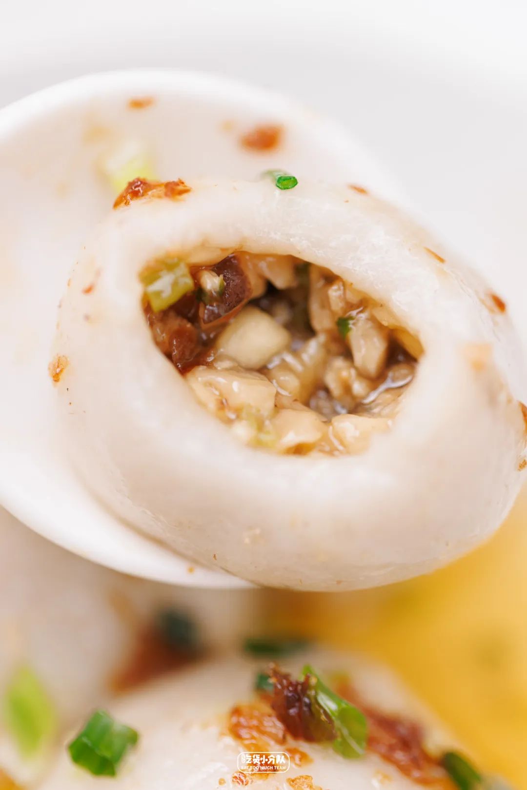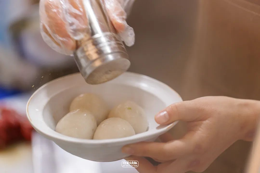 纯手工制作的芋包,目前店里的黄金招牌,卖得好的时候在上午就会早早售罄。工序从蒸芋头开始,到捣烂成芋泥,加入木薯粉揉搓,调馅儿,包馅儿,全是店主手工完成的,所以两个多小时也只能出品40个左右。芋包外皮十分细腻Q弹,滑滑糯糯的,像Plus版咸汤圆。内馅不是固定搭配,各家有各家独门秘诀。为了有些海味在里面,会把比目鱼切成末,热油炸成酥,与肉沫一起爆香,再加入茭白、香菇、芹菜,味觉层次即刻丰富了。按照店主的话说,她家的芋包“最接近老家那边有人办喜事时,大锅里做的芋包的味道。”是逢年过节的喜庆味道~
