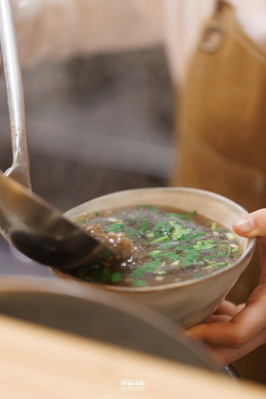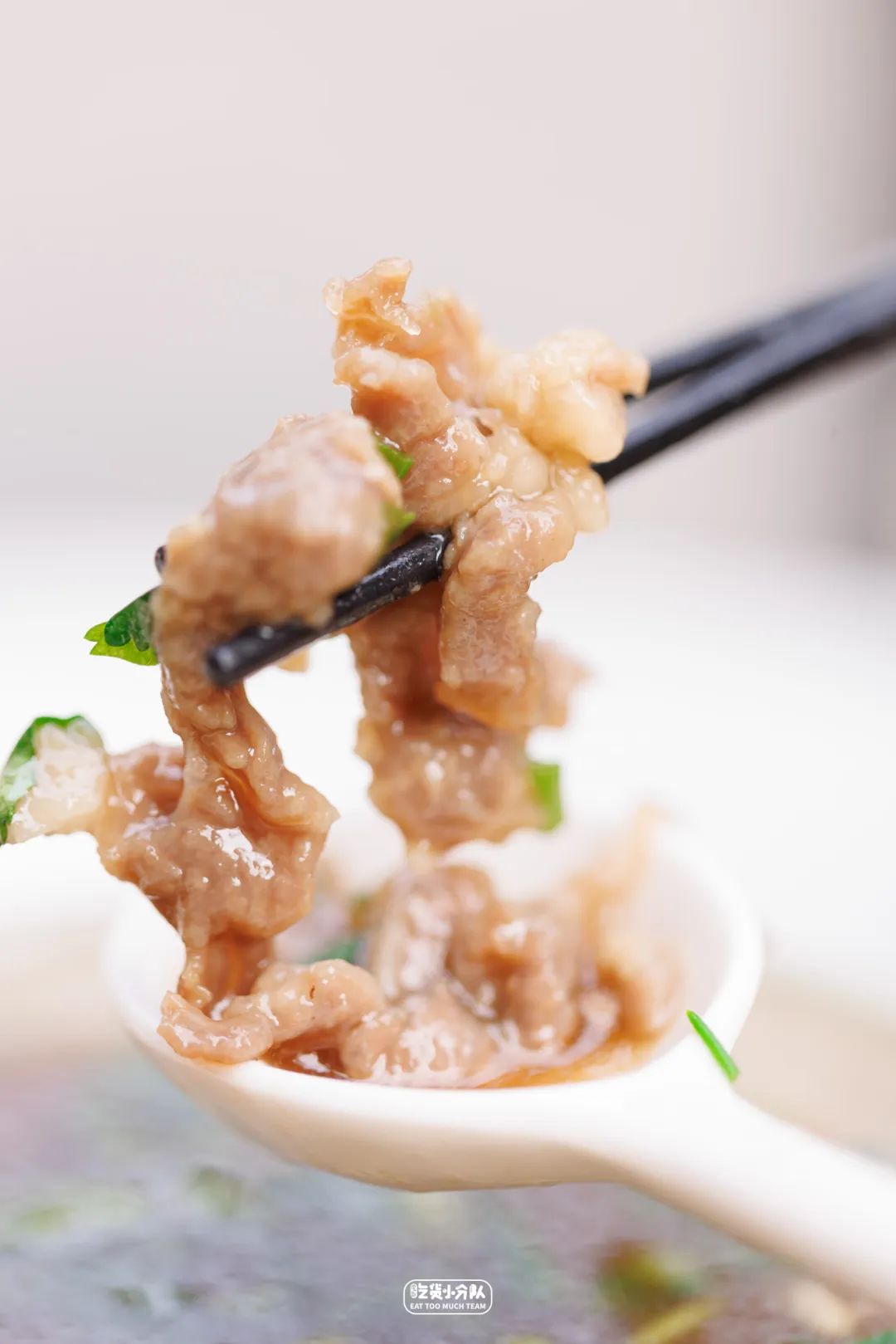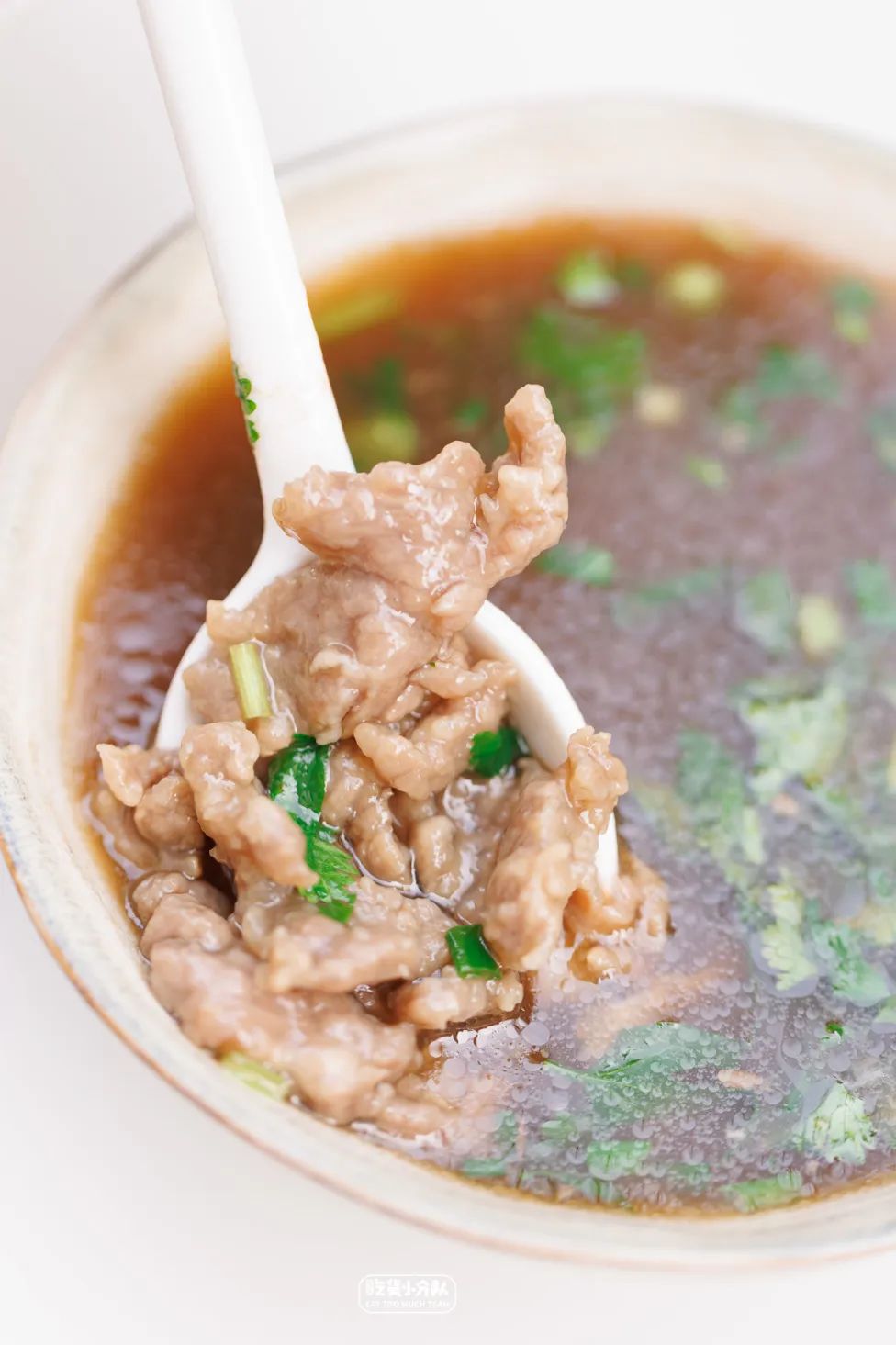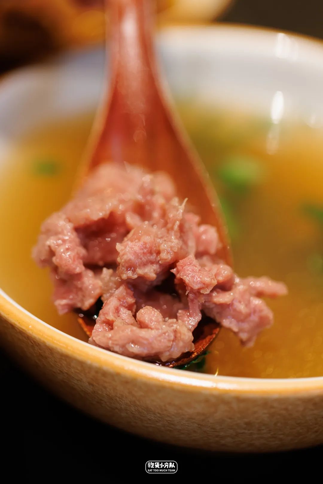 牛肉羹分为软羹与硬羹,硬羹是将鲜牛肉切薄片,而软羹需要将牛肉剁碎。制作软羹也是较费手工的活,要纯手工剔除新鲜牛后腿肉上的筋膜,而后剁碎,还要不停搅打,切条加地瓜粉腌制,整个过程耗时3-4小时。但这样的牛肉吃起来嫩滑之余,也嘎嘎有嚼劲。汤底是每日清晨鲜炖4-5小时的牛大骨汤,因为加入了川穹、当归、大量的生姜,在冬天热腾腾喝一碗暖心暖胃很舒适。