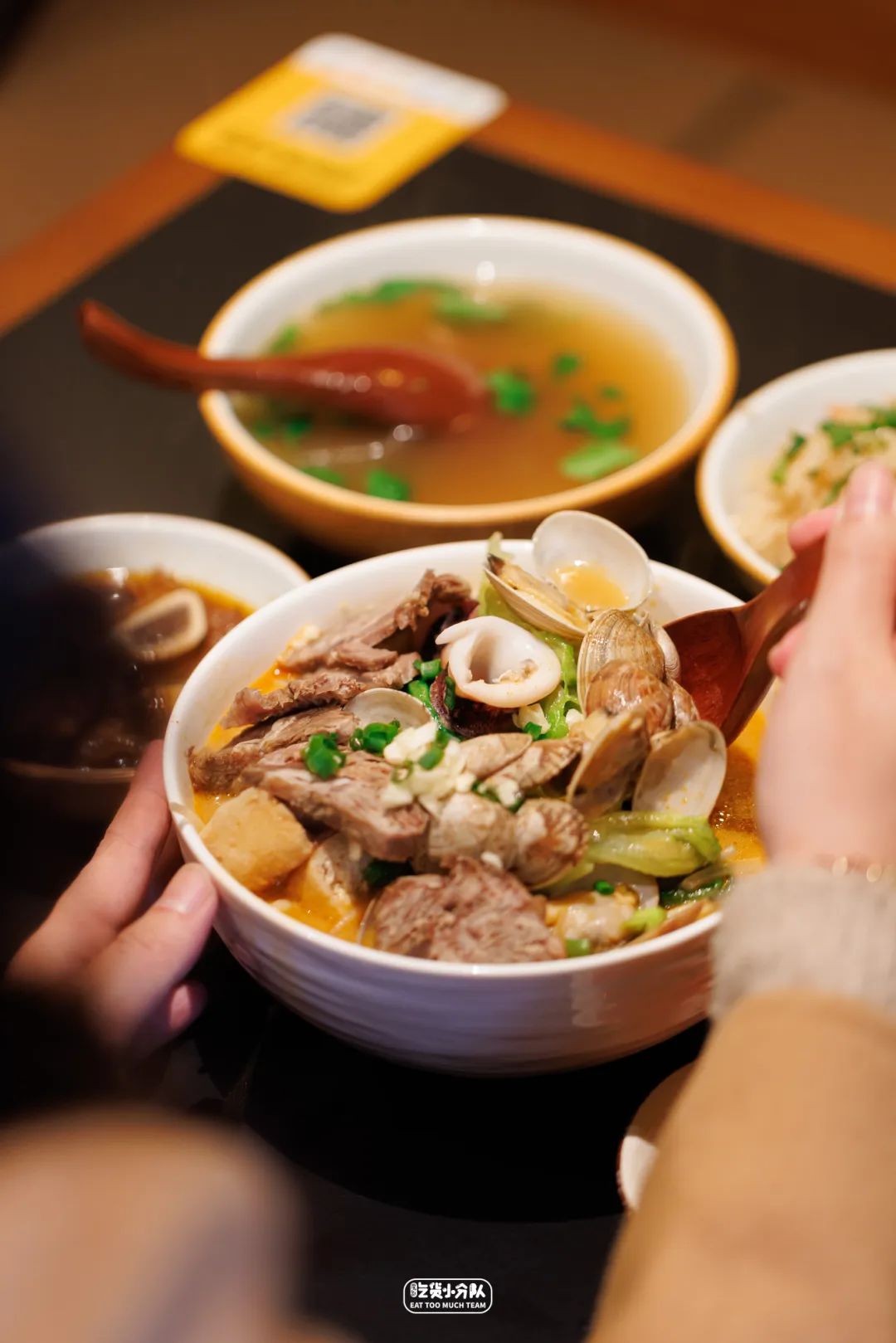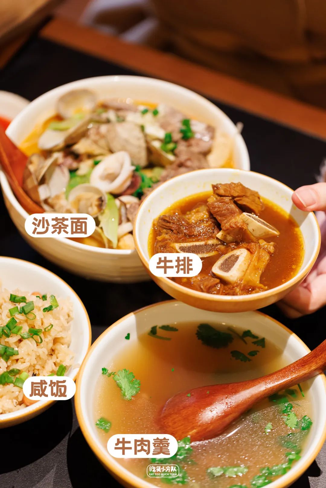 比起福建当地,它家的沙茶面更像是“入门版”,汤底吃起来偏柔和,少了些浓郁带劲儿的醇厚,适合能接受沙茶口味,口味清淡的人,油面也偏软少了些筋道,综合客人的反馈,它家将会在后续稍微调整。〔 牛排+咸饭+牛肉羹 〕