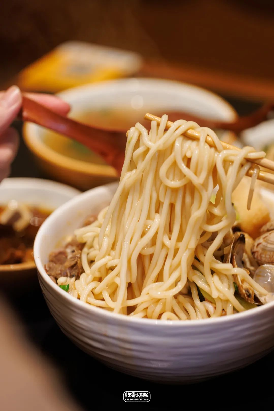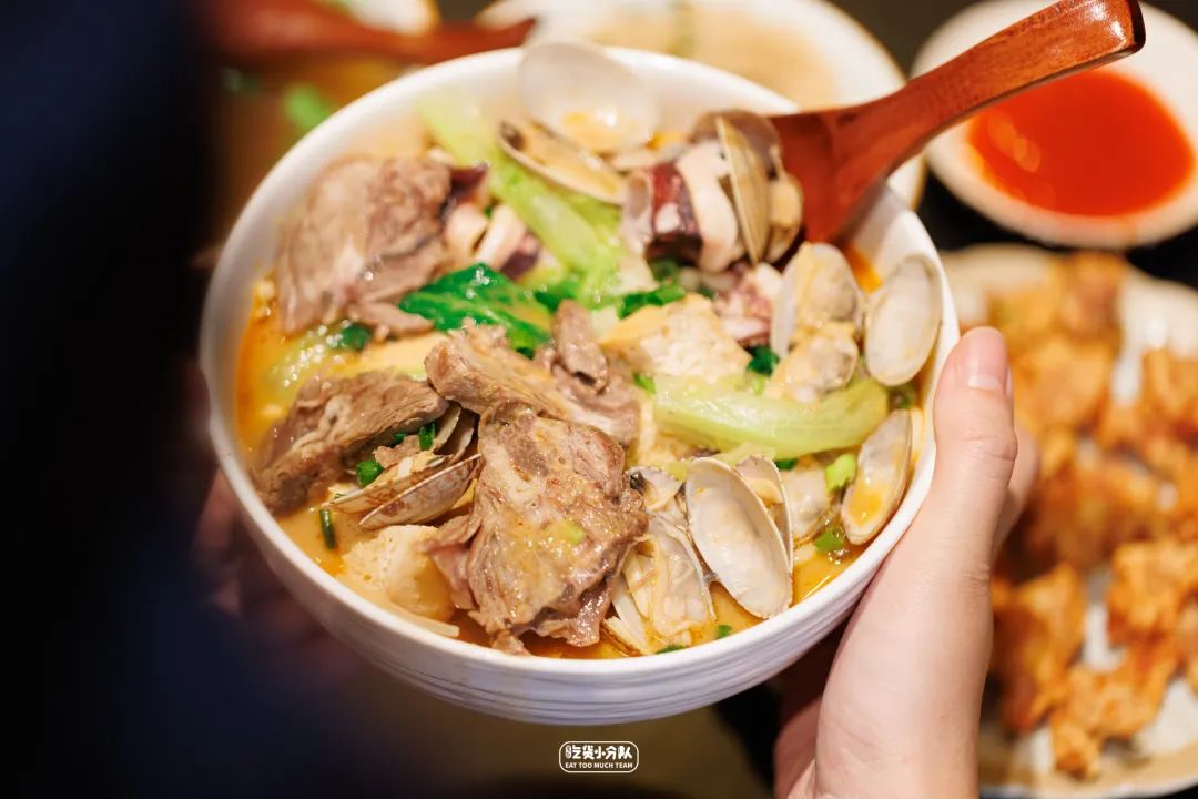 沙茶面据传最早是由华侨从东南亚带入中国的,在闽南语中称为“sa-te-mī”,大家最好的那一口就是鲜美醇厚的汤头与独特的沙茶酱风味。它家的沙茶酱汤底,在海鲜的鲜香之上,融入了自家烘干后打碎的虾粉,和农家自打香味浓郁的花生酱,在每日炒酱之前,还会熬大量的蒜酥融入,让风味再添一层。沙茶面的浇头,有荤有素有海鲜,可以选固定套餐也可根据喜好自选。