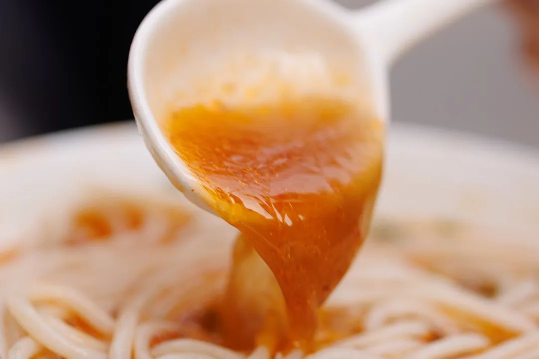 米粉是特地从福建当地采购来的,QQ弹弹,又不易煮烂…在看到“牛肉丝”浇头的时候难免眼前一亮,这简直是龙岩牛肉粉的特色标配。老板母亲老店里卖的牛肉丝,是很多人逢年过节回家都会打包几盒带走,甚至经常要求专门邮寄的程度。制作时,先把牛肉煮干,再加入1层厚厚的秘制辣椒粉与牛肉热油重新煸煮,牛肉丝入口微微辣,很有嚼头,越嚼越香,喜欢牛肉干的人一定也会超爱~小时候吃牛肉粉,为浇头是选“鲜牛肉”还是这种“牛肉丝”,都会纠结好一阵!辣椒红油因为和牛肉一同煸煮过,也添了一层“牛香”,拿来拌面拌粉都是一绝,香迷糊了。