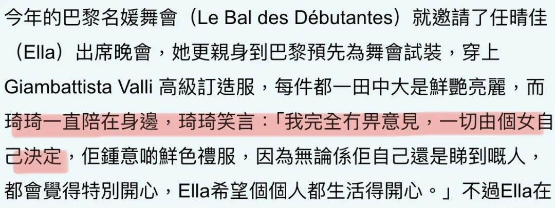 ▲ 夫妇俩爱女心切,女儿任晴佳提前飞到巴黎试高定,琦琦不仅全程陪同,并且一切交给女儿自己决定。出现在今次名媛舞会上的香港名媛除了任晴佳,还有赌王四太的小女儿何超欣,以及盈大地产千金李朗怡。