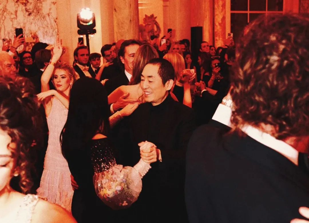 ▲ 在舞场上的张艺谋也是导演范儿十足哈,亲自指导女儿走位,身后一袭红衣的任晴佳拉着老爸任达华前来和老谋子父女社交。
