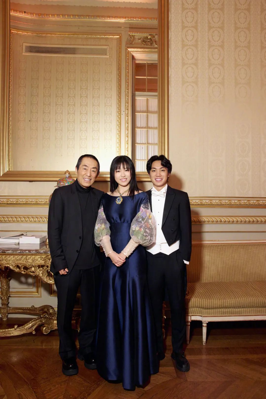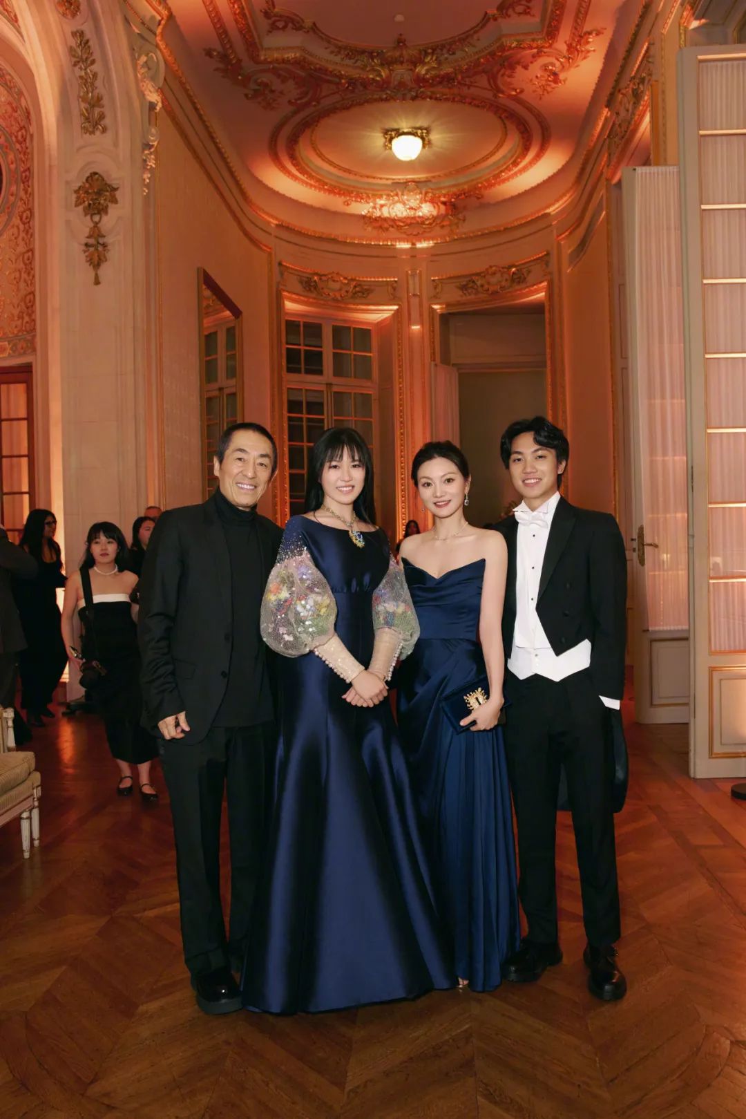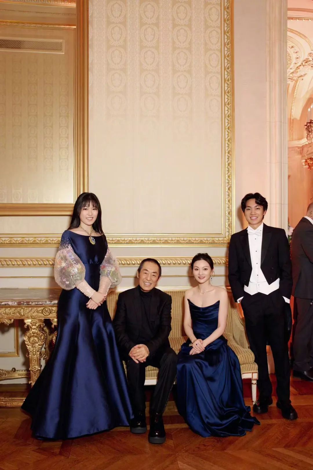 ▲ 张艺谋、太太陈婷和二儿子张壹丁、女儿张壹娇。站在父母和哥哥身边的张壹娇,显得自在放松多了。陈婷当晚和女儿一样,身着深蓝色礼服,只不过她的选择更加适合这种舞会,气质相当出众。