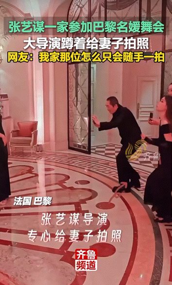 ▲ 舞会上张艺谋不仅亲自指导女儿跳舞,还蹲下给老婆各种找角度拍照,看得出他很享受和家人在一起的时光。