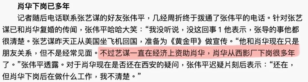 ▲ 与巩俐分手后的那些年,张艺谋在公开场合一直是单身身份(其实那时他已经和陈婷在一起了),外界频传他已和前妻肖华复婚,根据2006年张艺谋前制片人张伟平的说法,肖华已从西影厂下岗很多年,经济上一直依靠张艺谋的资助,二人只是朋友关系。如今的肖华似乎仍孑然一身,直到2011年,她都独自住在西影厂的家属院。