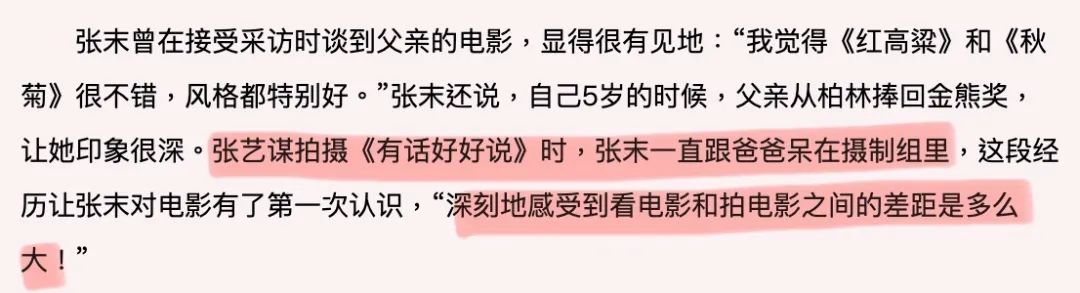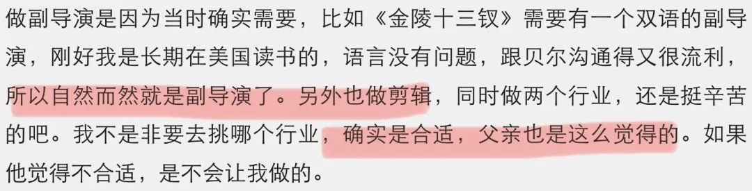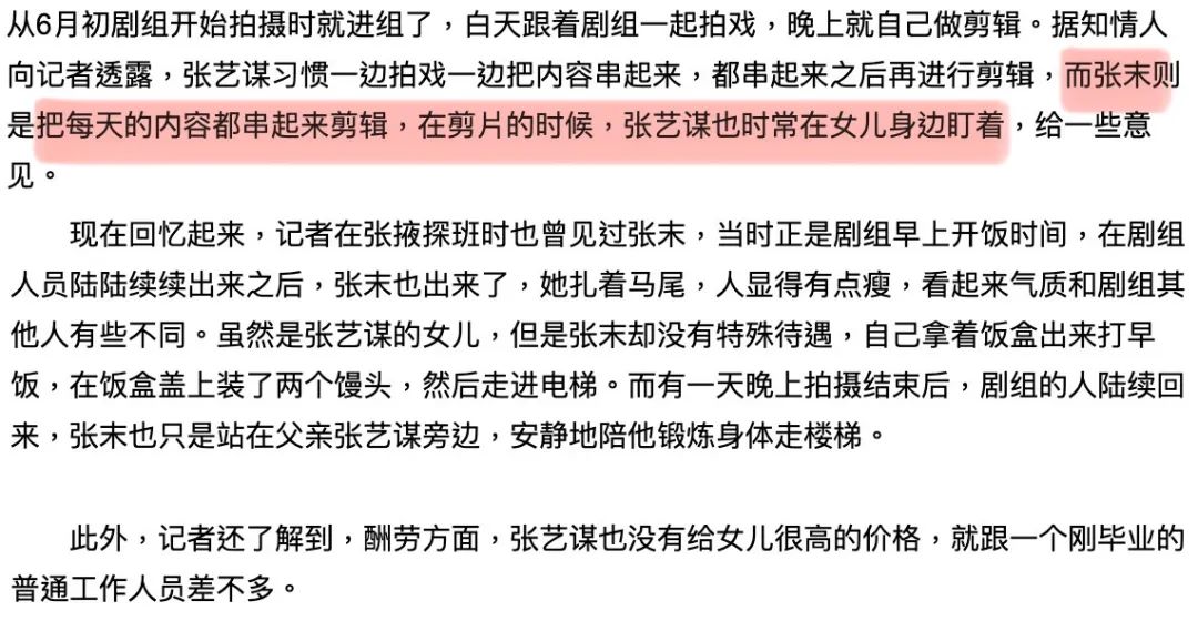 ▲ 虽然不搞特殊,但亲自手把手教起,老谋子培养起女儿可谓尽心尽力了。张末一入行就能跟在顶级导演身边学习,和行业内最优秀的同行一起工作,如此高的行业起点,当然绝非普通人可比的,这也是“子承父业”的星二代们的一大优势吧。