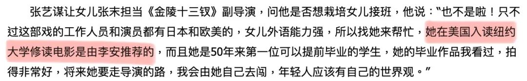 ▲ 张艺谋的电影,几乎构成了张末童年回忆中最重要的一部分,童年时的熏陶,再加上张末从小对父亲深深的崇拜,让张末决定“女承父业”,转学电影。在李安的推荐下,张末的研究生阶段进入纽约大学电影学院学习电影。