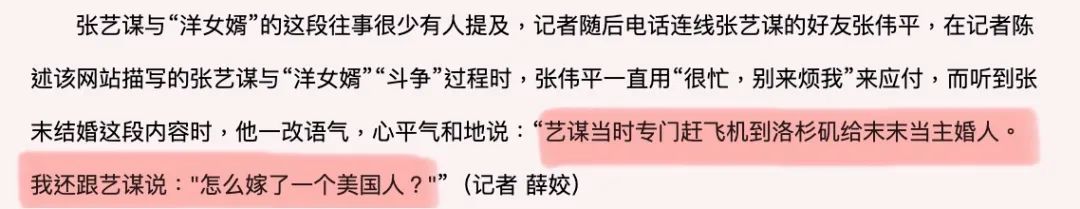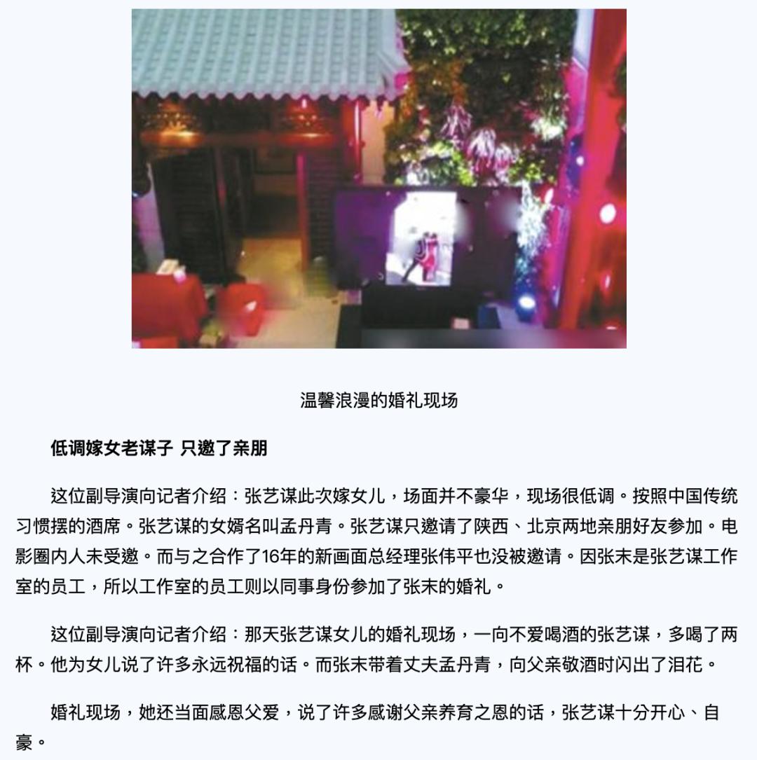 ▲ 尽管并不认同这段婚姻,又和女婿托维之间发生了很多不愉快,但张艺谋爱女心切,婚礼当天,张艺谋还是亲自飞往洛杉矶为女儿做了主婚人。张末和托维的婚姻后来不再被提起。