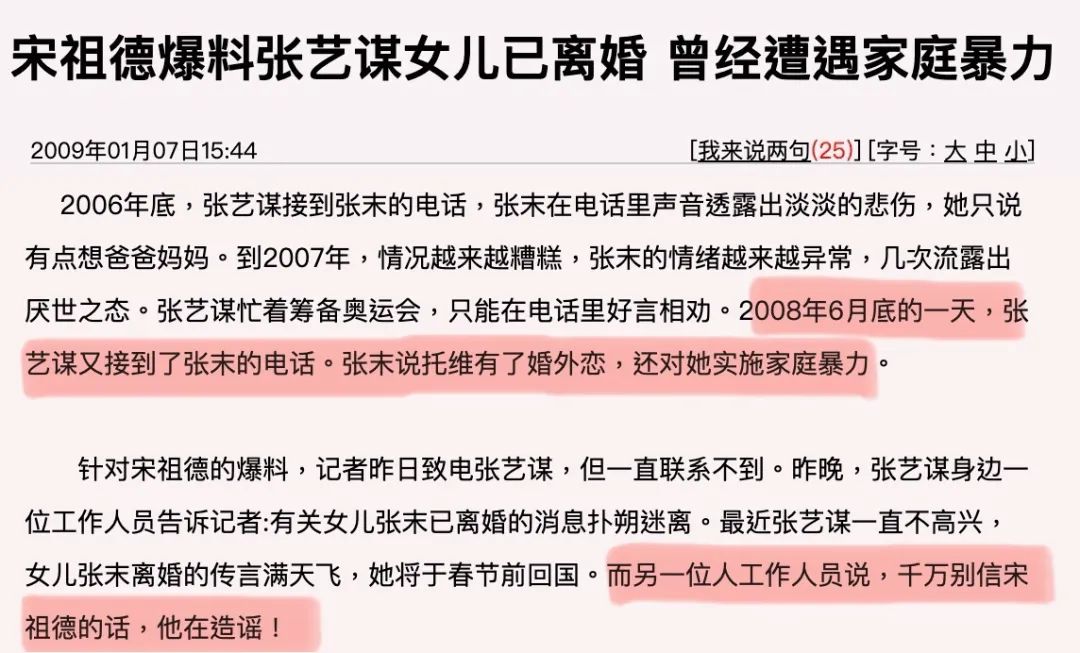 ▲ 关于张末和托维是因为家暴出轨是宋祖德爆出的,但宋的爆料有真有假不可相信,张艺谋本人一直是对此讳莫如深,不做解释。事实是,2009年初,张末很快从美国回国。