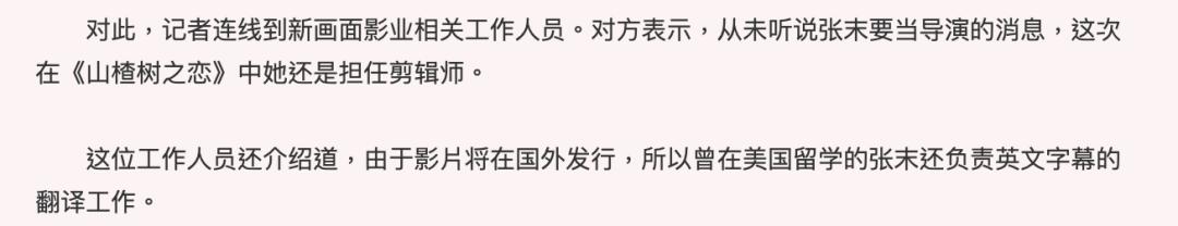 ▲ 张末曾在采访中说,刚入行的时候,(电影行业内)各种工种自己都试过一遍,唾手可得的工作机会和非常低的试错成本,也是作为导演女儿入行的另一大优势。2010年《山楂树之恋》,张末仍为剪辑师,以及负责电影英文字幕的翻译工作。