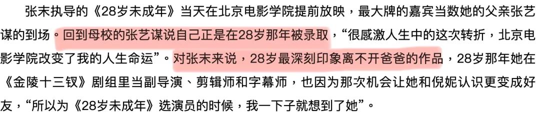 ▲ 对张艺谋来说,他与巩俐的关系早已随着两人事业的成功与人格的成熟,逐渐有了更丰富的层次,他们不仅仅是旧情人,而是两个知己知彼的艺术家之间的惺惺相惜和才华碰撞。就这样,入行5年,张末已经跟随张艺谋拍过4部电影,2016年,初步学有所成的张末开始尝试独立做导演,拍出了自己第一部作品《28岁未成年》。