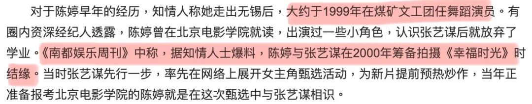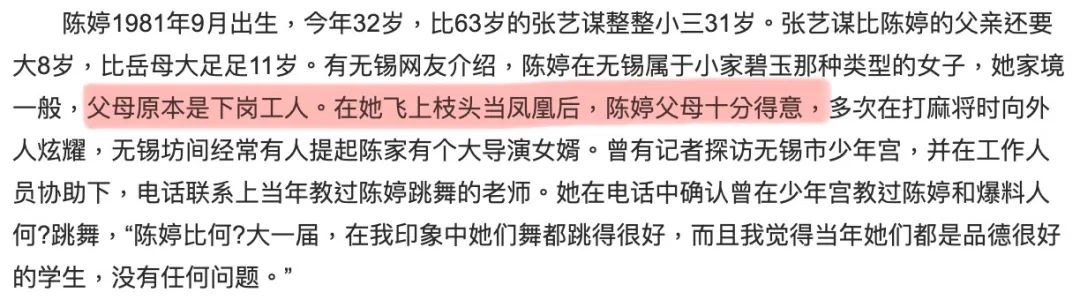 张艺谋的第二任妻子陈婷,1981年出生于无锡,据说陈婷父母曾是无锡的下岗工人,家境相当一般,陈婷早年是煤矿文工团的舞蹈演员。