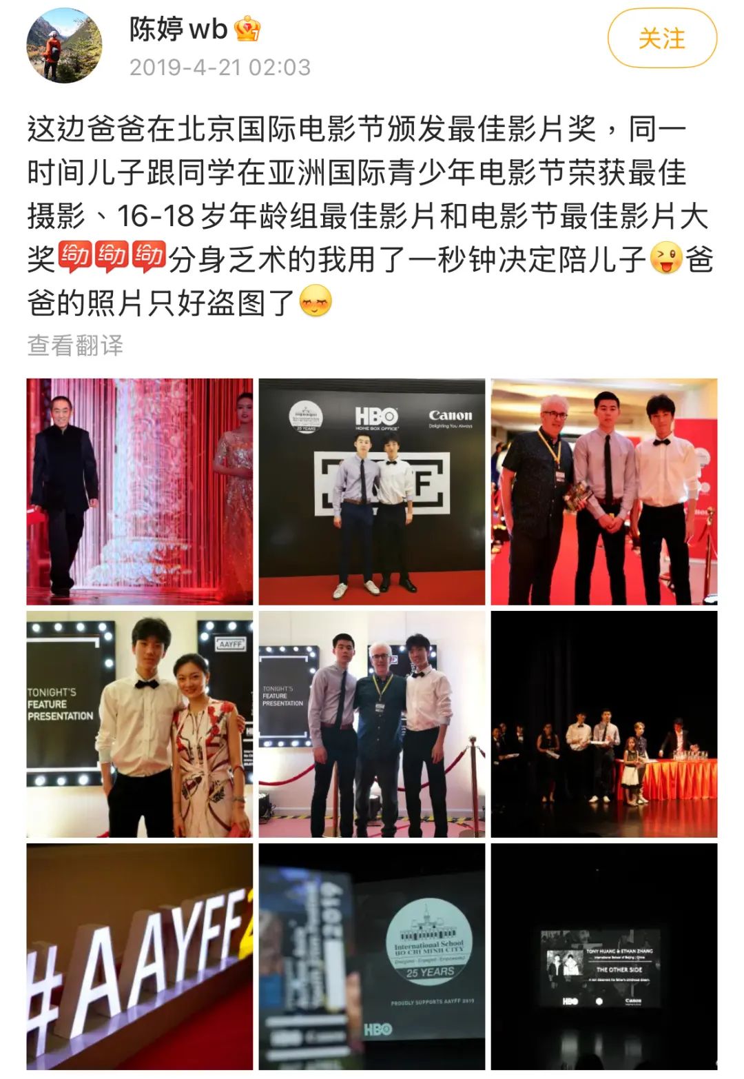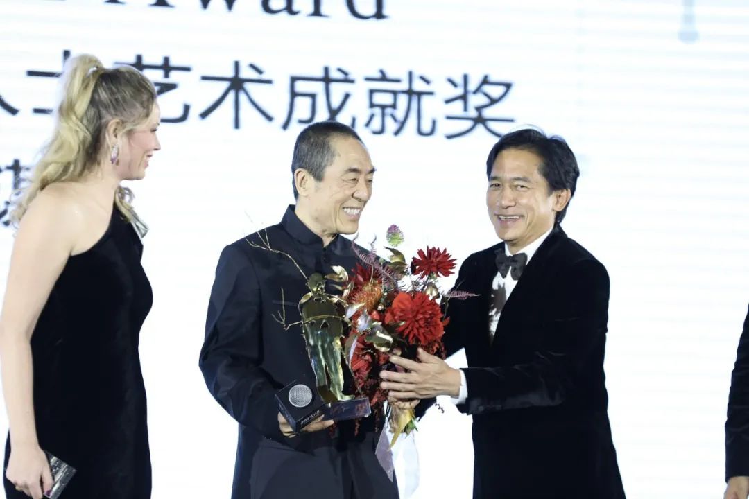 ▲ 2019年,张艺谋在上海获颁“卓别林电影人士艺术成就奖”,当晚,陈婷带着小女儿张壹娇共同陪伴张艺谋参加颁奖礼。