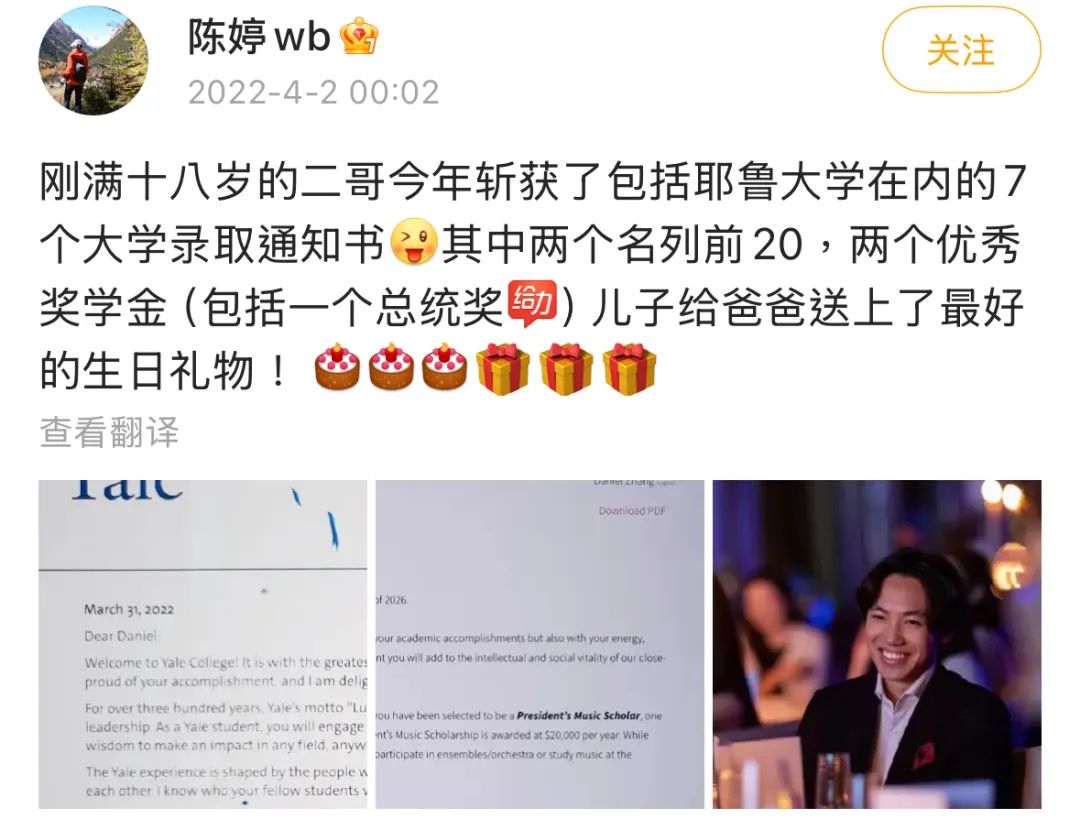 ▲ 2022年,张壹丁拿到包括美国名校耶鲁大学在内的7张录取通知书。张艺谋与陈婷的小女儿张壹娇,目前只有18岁,刚刚到进大学的年纪,这次参加舞会,也算是张艺谋陈婷夫妇馈赠给爱女的成年礼吧。