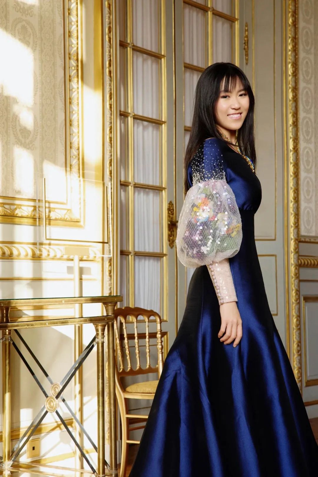 ▲ 张壹娇的这身深蓝色高定来自Alexis Mabille,礼服上的蕾丝花朵亮片装饰少女感十足,不过看得出小姑娘比较传统.....