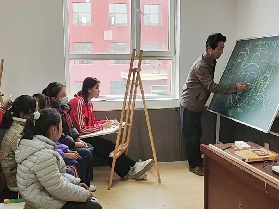 非遗老师拉龙多杰指导青海循化文都中心小学学生学习人物、动物和植物等素描以及染色和勾线唐卡是藏族文化中一种独具特色的绘画艺术形式,2006年唐卡被国务院、文化部批准确定的第一批国家级非物质文化遗产名录。