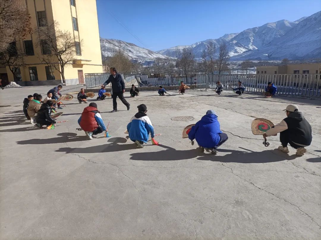 非遗老师道吉才让指导青海循化道帏中心小学学生学习藏族螭鼓舞基本动作:左右转、边跳边敲打藏族螭鼓舞是流传于青海省循化撒拉族自治县藏族聚居区的一种大型民间祭祀仪式舞蹈,于每年农历六月举行,旨在祈求神灵、禳灾驱邪,保佑村民人寿年丰、五谷丰登。