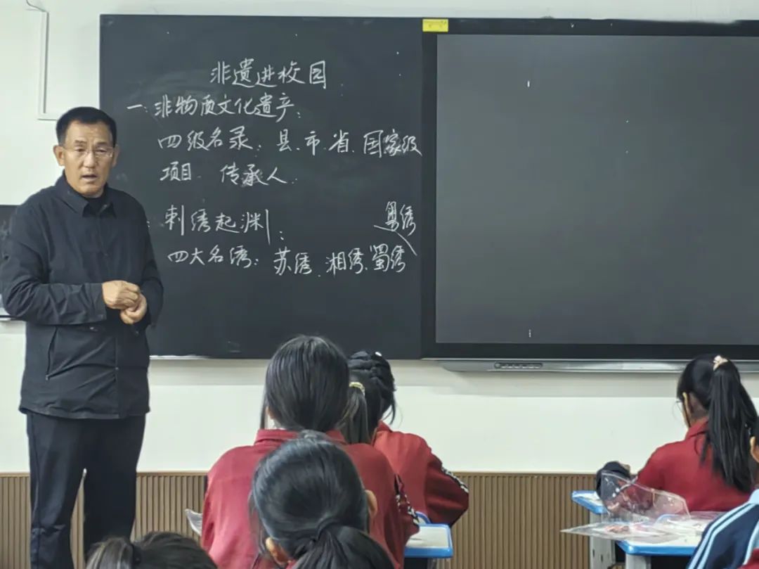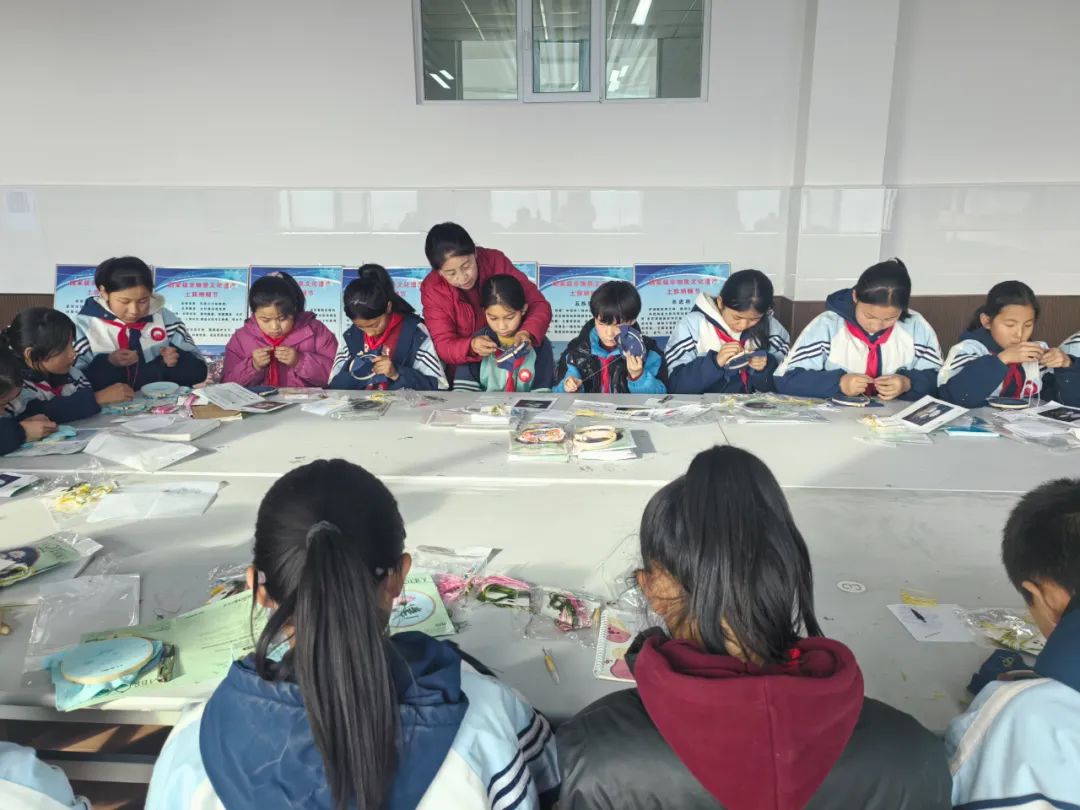 非遗老师邓西银为青海民和古鄯镇中心学校学生介绍非遗文化以及河湟刺绣