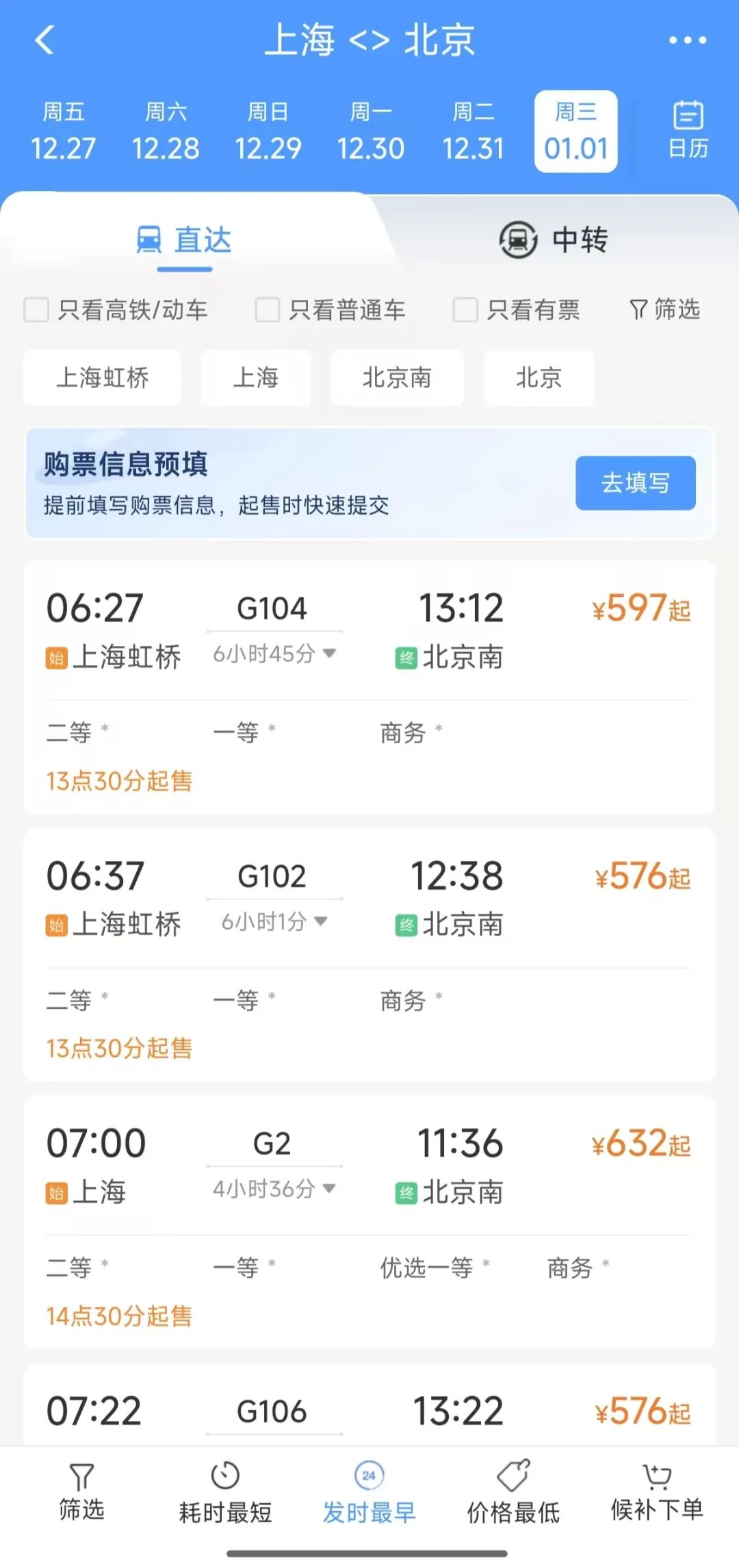 购票信息预填在车票起售当日,预先填写乘车人、车次、席别等信息,在车票开始发售时,一键提交订单即可。