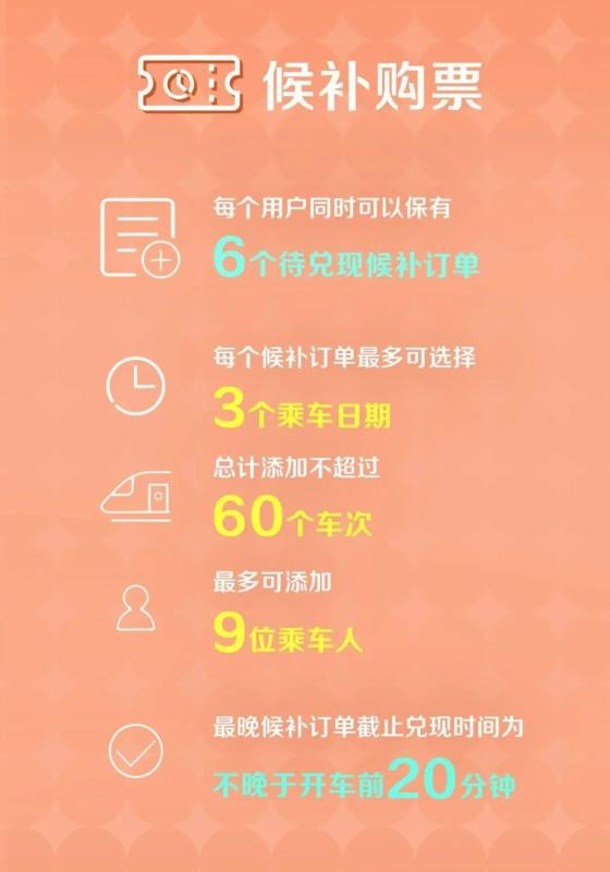 候补购票每个用户可以有6个待兑现候补订单,每个候补订单最多可选择3个乘车日期,总计添加不超过60个车次。